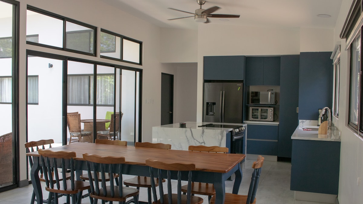 One of the best ocean and mountain views in Playas del Coco! We welcome everyone! Perfect for couples, families and remote workers. Fully equipped house, located at the top of a mountain inside a gated community, 10 minute walk to the beach. Grocery stores, restaurants and stores nearby. Short drive from Liberia Airport (20 min). Enjoy a concert of birds and monkeys every dusk and dawn, spectacular sunsets views of Playas del Coco. Close to nature, but not far away from commodities!