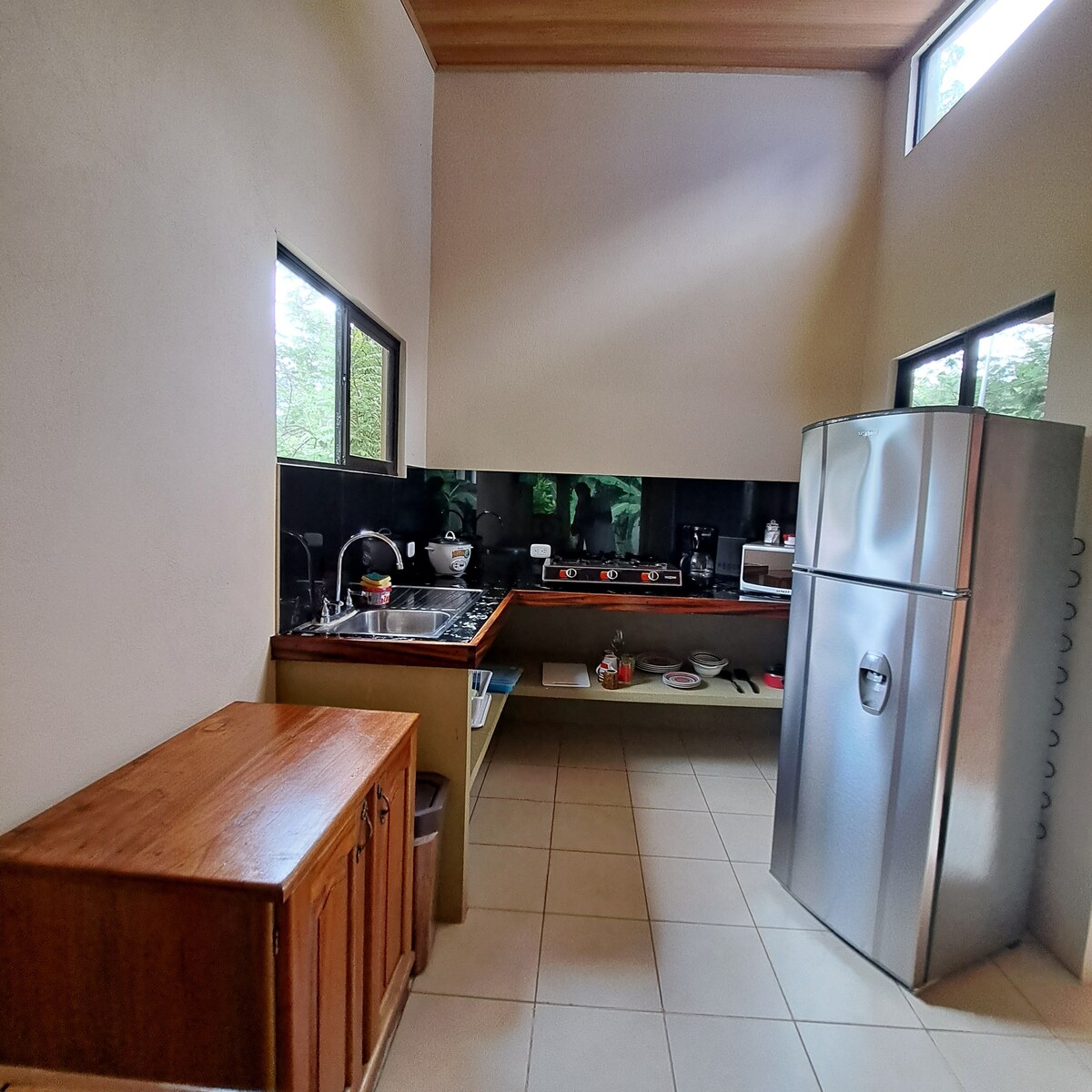 Bungalow totalmente equipado en medio del bosque tropical , a 15 minutos del centro de Quepos (( carretera-pavimento)) un lugar genial para los amantes de la naturaleza y quiénes le gusta la paz y tranquilidad que ella ofrece, muy buen lugar para el avistamiento de aves. Tiene capacidad para 3 personas, área de cocina equipada, sala de estar, cuarto privado , (WIFI), parqueo privado y piscina.