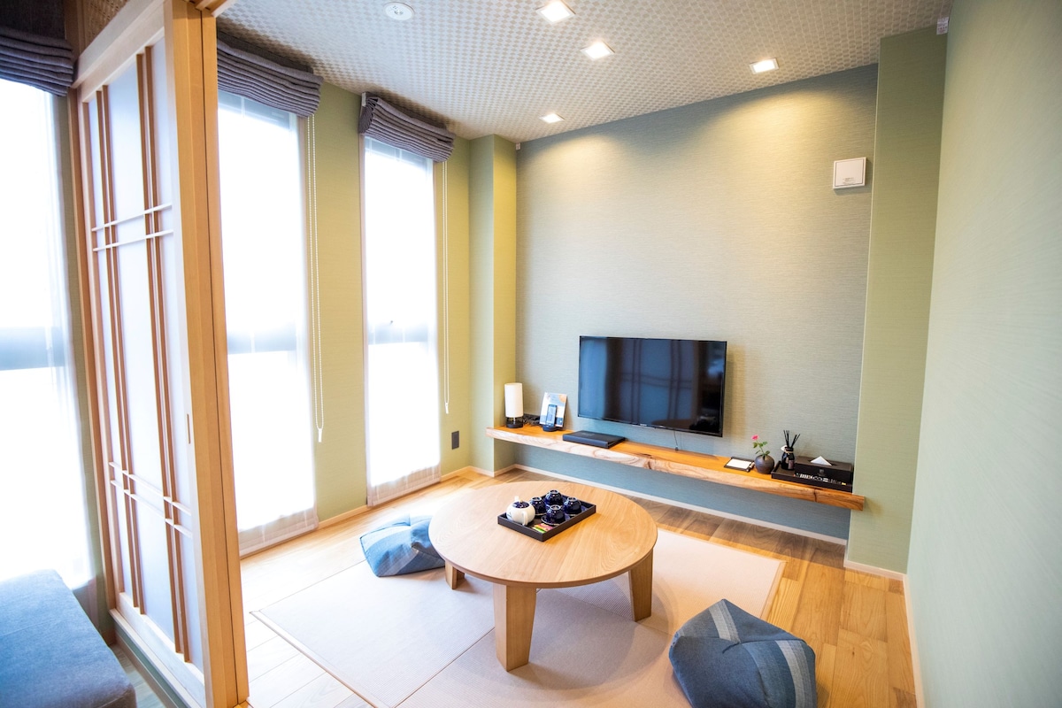 Newly opened in March 2019, Sola Hotel is built with custom Japanese wood furniture, unique handcrafted Japanese wall paper and decorated with a modern touch. Enjoy Tokyo’s beautiful skytree view from our rooftop lounge, a unique setting in downtown Tokyo. All rooms and suites include full service kitchen with all utensils, fridge, tv and free WiFi. All beverages in the fridge are complimentary. Our suites offer an outdoor balcony with nice seating area for your private enjoyment.