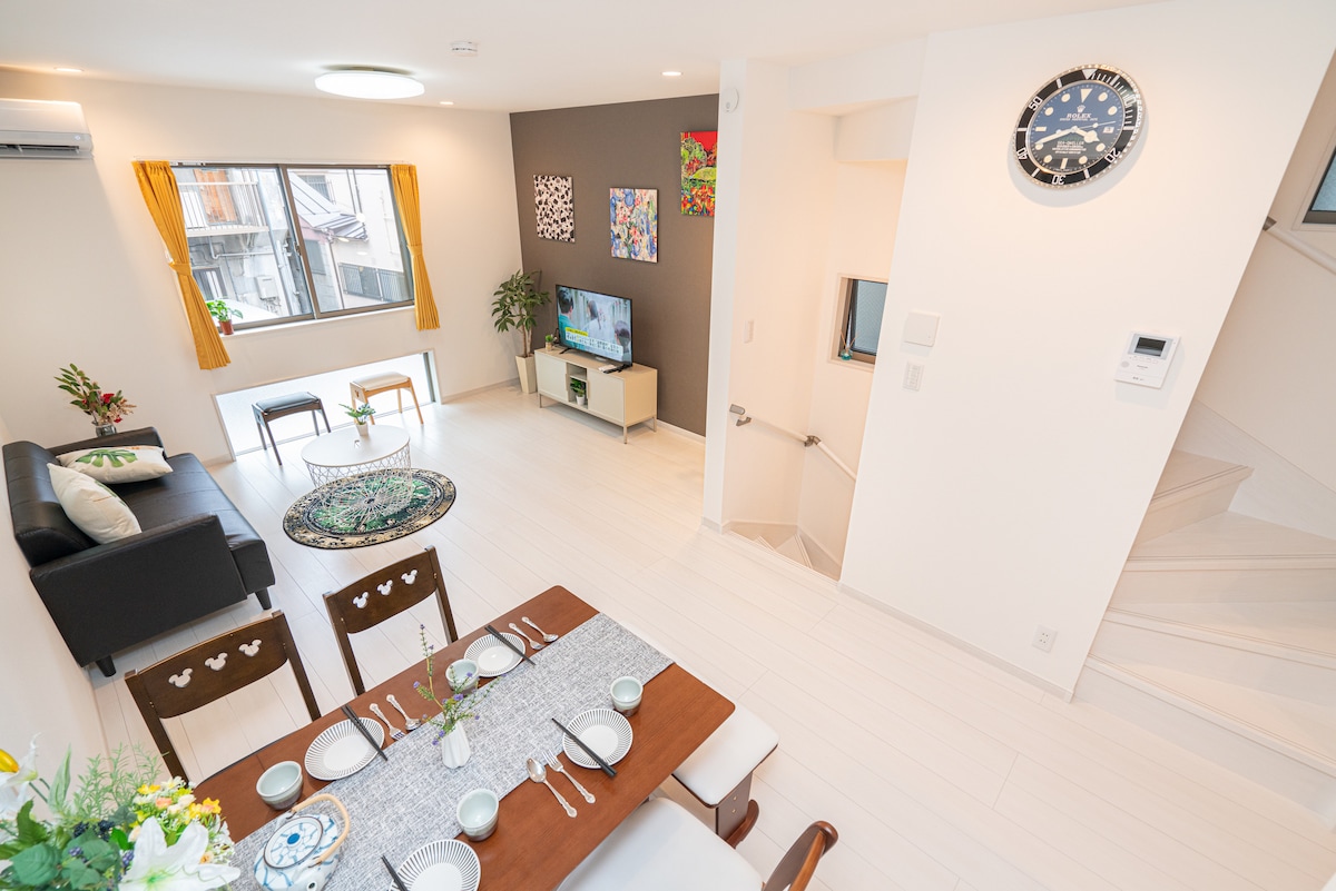 Newly-built whole house conveniently near the station with no transfers from Haneda and Narita Airport! The living room is approximately 12 tatami in size, making you feel like you are at home. All furniture and appliances are new and high performance. Bedding linens are changed after every cleaning. There's a bathroom dryer's funtion, dishwasher, and bathroom, as well as a shower room and two washbasins and 2 washing machine. Great for large groups and long stays.