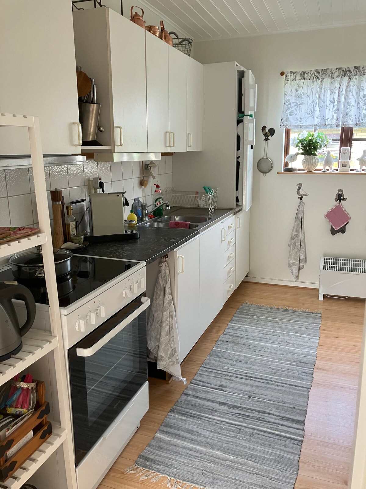 Renovated (2020) cozy guest apartment of approximately 35 sqm in an old former pig house in the middle of Ăsterlen with unobstructed views of the wide fields. Hammenhög is the nearest village. (2.5 km away) The apartment is adapted for two people. Open-plan with social area, kitchen with dining area with space up to the sleeping loft where the loft staircase leads up to the double bed. Toilet with shower and heated floor. West-facing patio outside the entrance. In the kitchen, there is a stove, oven, refrigerator, coffee maker, kettle and cooking equipment.