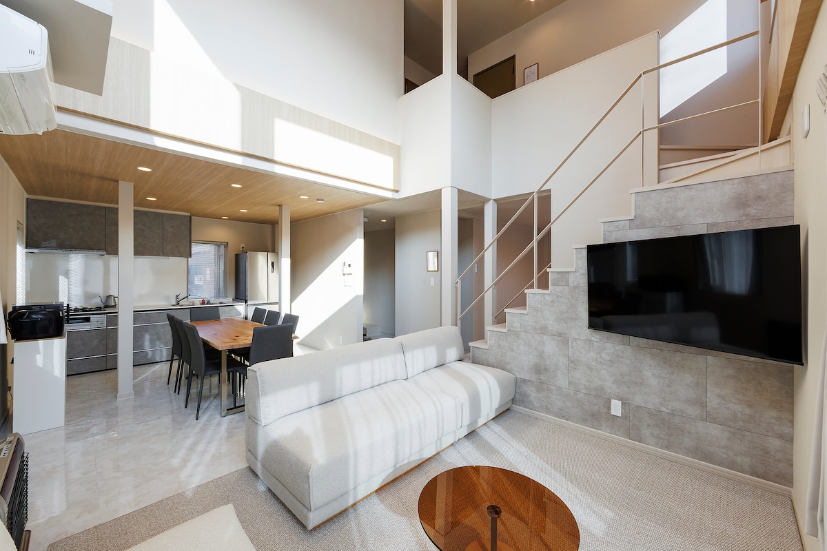 The living room with a high ceiling and an atrium It feels like a villa. Please relax while feeling the light and the space. If you leave the house and walk a little, you will find the sea. It is a location where you can feel the scent of the tide, the sound of the waves, and the ever-changing colours of the sky. [Room details] ・ 4 bedrooms - 2 bathrooms 2 toilets ・ Parking available for 2 cars All rooms are air conditioned.