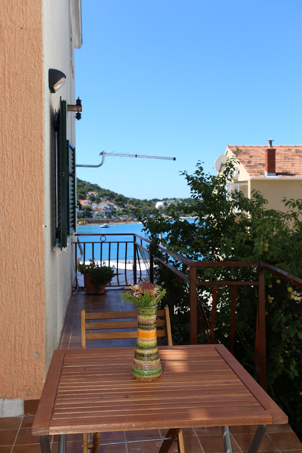 The apartment is located on the mainland side of Tisno, near the beach Jazina. Apartment is at quiet location and yet is just a 15 minute walk to the town center Tisno.Apartment has: bathroom with toilet, kitchen, dining room and bedroom with double bed. From the outside it has a covered terrace with a sea view and parking space. From the equipment the apartment has: wi-fi, TV and air conditioning. Pleasant place in quiet part of Tisno in second row from the sea.