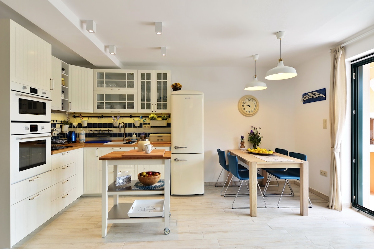 Brand new modern and stylish apartment centrally located, close to the beach, and with a beautiful view. This spacious (90 m2) modern flat consisting of two bedrooms, two bathrooms, a huge, open plan kitchen with the living room area, and the terrace is fully equipped for a very comfortable stay. Just a few minutes walking distances to the main square but still situated in a quiet neighborhood.