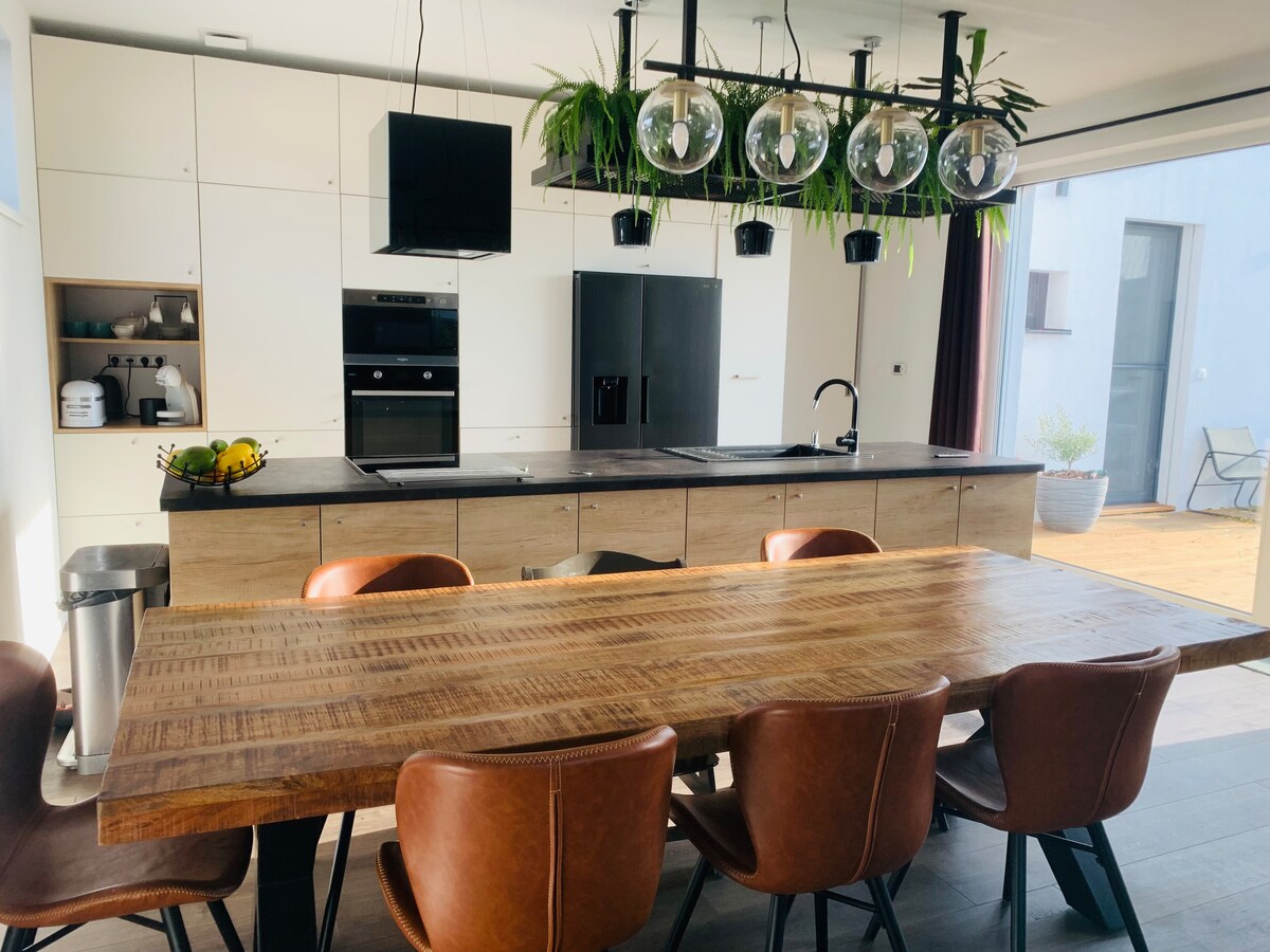 My house is situated in beutifull town in small distance from Bratislava.(20min) Area is very private with all new-build houses around, very close to vineyards and woods close by. It' s suitable for 6people. Downstairs area consists from one large open living area with large sofa, television and kitchen with all equipments, dishwasher,fridge-freezer,oven,microwave and all electrical appliances needed. Upstairs have 3 large bedrooms. Every bedroom have a smart TV. One Bathroom with bath,shower,toilet and washing machine. The house is perfect for larger families,group of people,couples or alone travelers for holiday or business trip, good for few-days stay, longer stay. Outside have a large garden with small swimming-pool,large patio with BBQ grill,lovely sitting area for summer days.