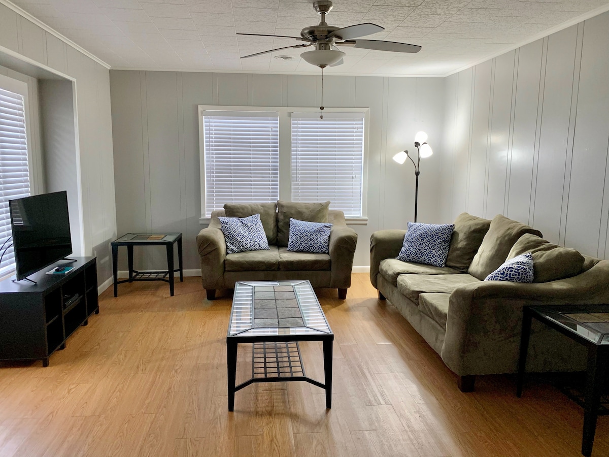 This newly constructed, spacious property offers stylish and modern comfort for any traveler. With hardwood floors throughout, the welcoming entrance flows into an open floor plan with a cozy living area and fully functional kitchen, and the central hallway leads to a modern bathroom between two private bedrooms. The laundry room located behind the kitchen leads to a great back patio, a large back yard, and a paved driveway, all surrounded by a privacy fence in a convenient location.