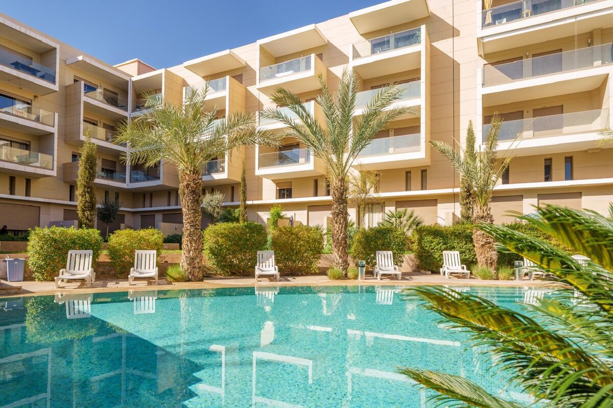 Évadez-vous dans un cadre élégant et relaxant à seulement 2 minutes du grand stade de Marrakech . Appartement moderne et confortable, parfait pour un séjour inoubliable. Plongez dans la piscine de style complexe hôtelier et profitez aussi d’un accès au parc aquatique disposant de 2 piscines dont une exclusivement pour femme et de plein d’autre activités pour vos enfants .