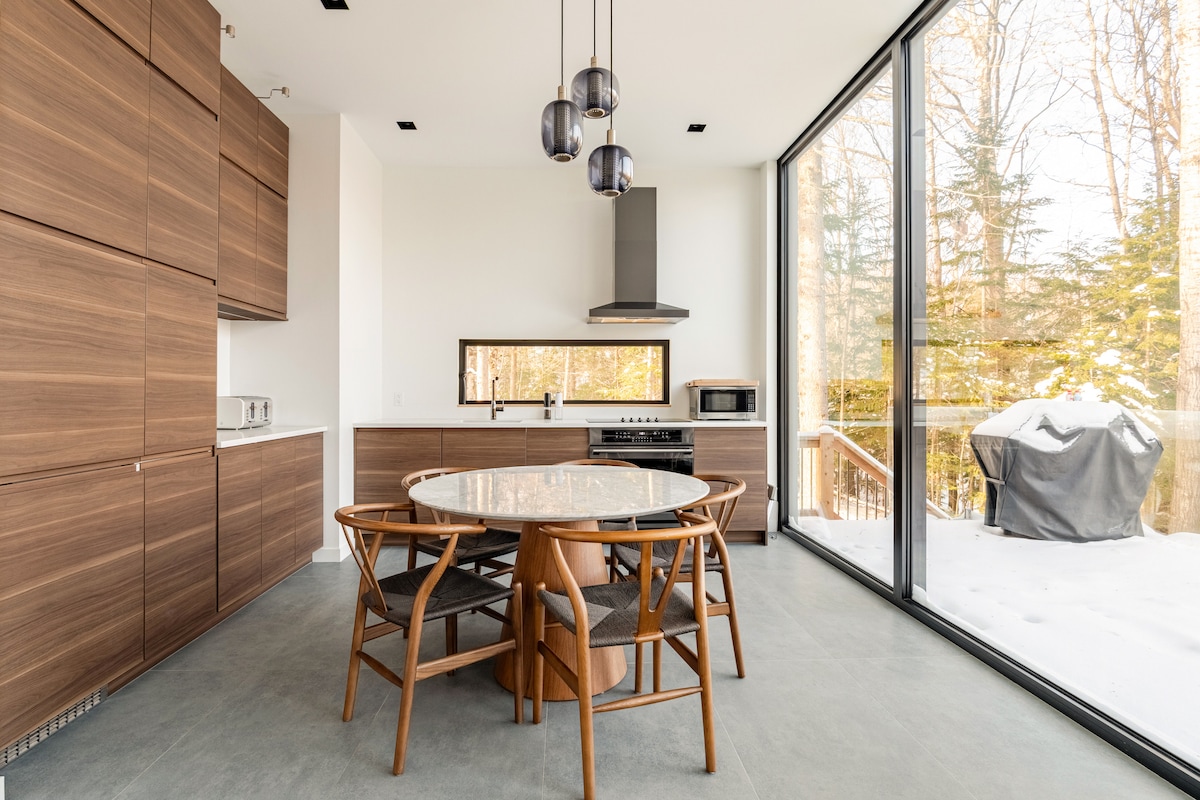★ One of the most unique chalets in Mont-Tremblant★ Unique & Secluded all White Glass Treehouse with Breathtaking Mont-Tremblant mountains views! The cabin is majestically glazed architectural space combining natural simplicity and contemporary luxury, 10 min from village of Mont-Tremblant, Ski Tremblant. Nestled on the end of the cliff with a fully glazed living space, Bathtub with view, The Panoramic terrace & Private hot tub for an unparalleled relaxation experience. Canadian Designer.