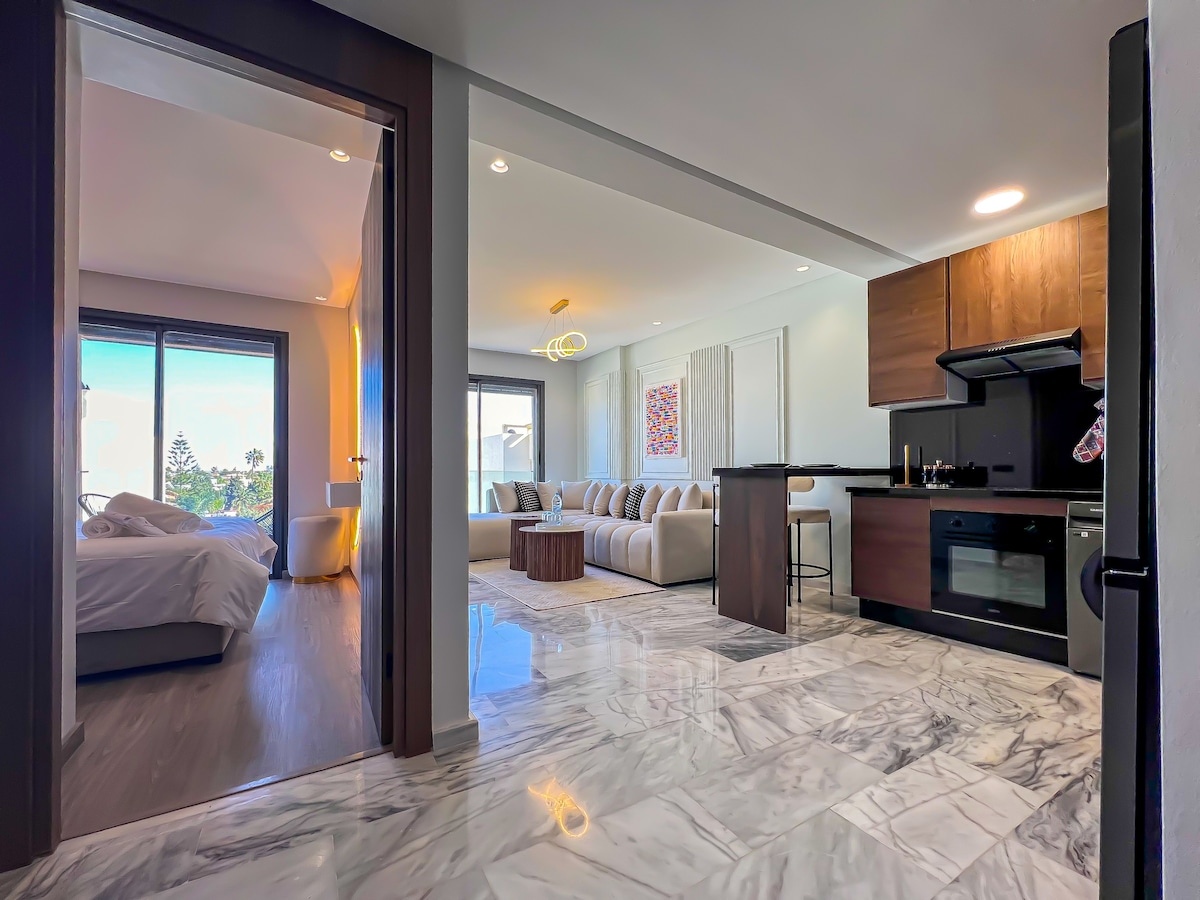 Perla 403 💎, a haven of peace where the elegance of a modern residence is combined with the comfort of 5-star hotels in the heart of Casablanca! Relax in a spacious living room with a modern design, equipped with a 55" Smart TV with Netflix and IPTV for evenings of absolute relaxation. The bedroom, a real cozy nest, promises peaceful and restful nights ☁️ From your private balcony, admire the splendid sunsets over the city, making every moment of your stay unforgettable! ✨