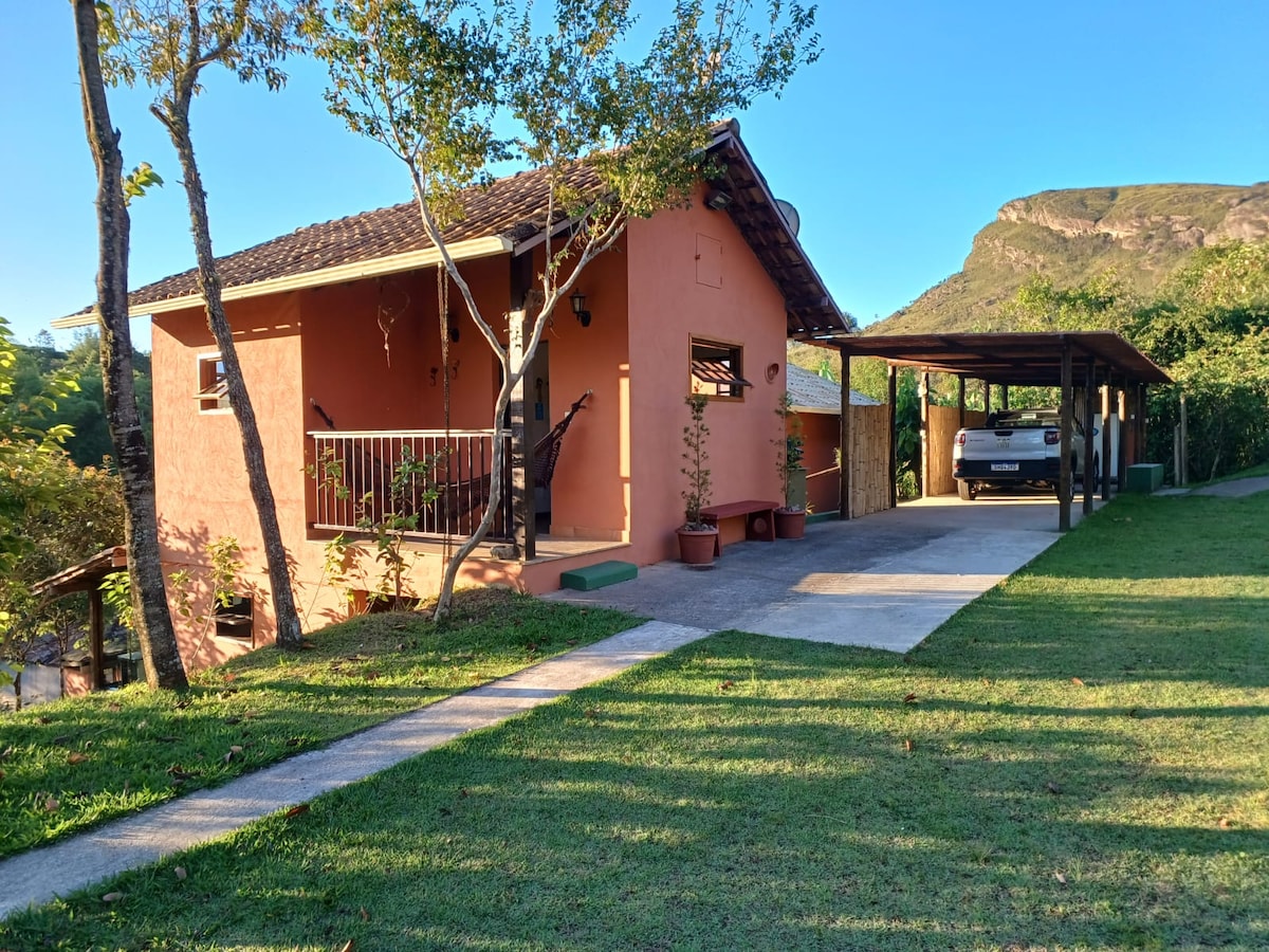 🏠BETWEEN THE TREVO DA CHAPADA AND THE VILLAGE OF LAVRAS NOVAS, there are TWO individual chalets. You will enjoy a very Minas Gerais experience, in this little place all decorated with local handicrafts, a backyard with a wood stove, a floor fireplace, sun loungers, hammocks and a suspended hammock, right in front of one of the most beautiful views in the world, Serra do Trovão, adorned by a valley that mixes the Atlantic Forest and Cerrado. We await you in this simple and charming corner of Geraes!🌻