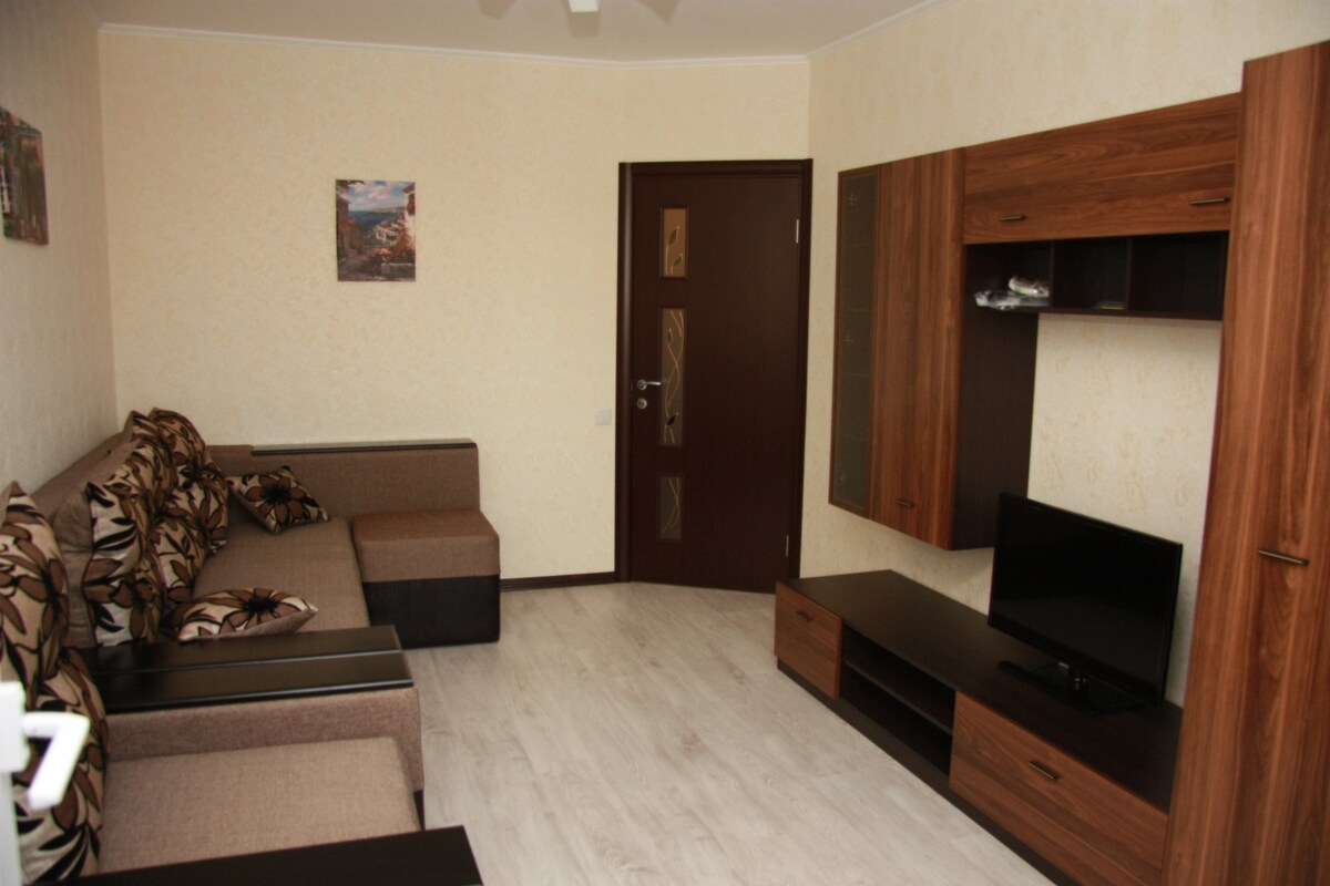 Cozy apartment with a balcony and modern appliances. We offer a stylish and comfortable apartment for a comfortable stay. A spacious balcony with a view where you can enjoy the fresh air awaits you. There is a playground in the yard, which is especially convenient for guests with children. The kitchen is equipped with a fridge, microwave, and everything you need for cooking. Wi-Fi, large 50-inch Smart TV. The apartment has a shower, bathtub, toilet. Large loft bed. 10 minutes to the supermarket.
