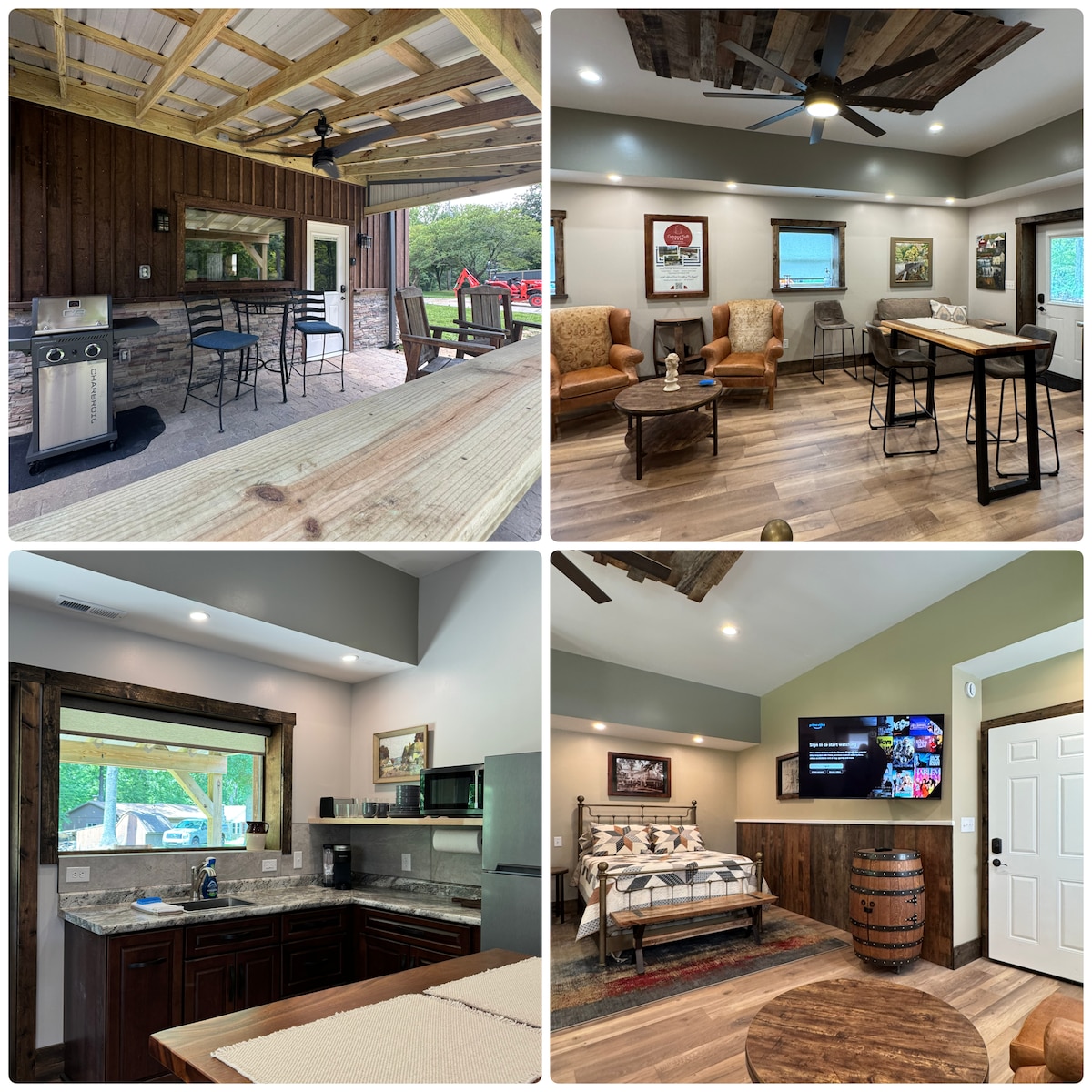 Relax in our quaint guesthouse. Have access to our beautiful farm. You will be staying on a working farm/vineyard. Walk in the woods back to the river or explore the orchard. Set up on the patio of the barn to watch the abundant wildlife or have a fire in the firepit. Food, wine tastings, and beer are available Wednesday through Sunday during winery hours. Things change here often as we are still building the winery, so come see what is new. Also visit the chickens, ducks , and turkeys.
