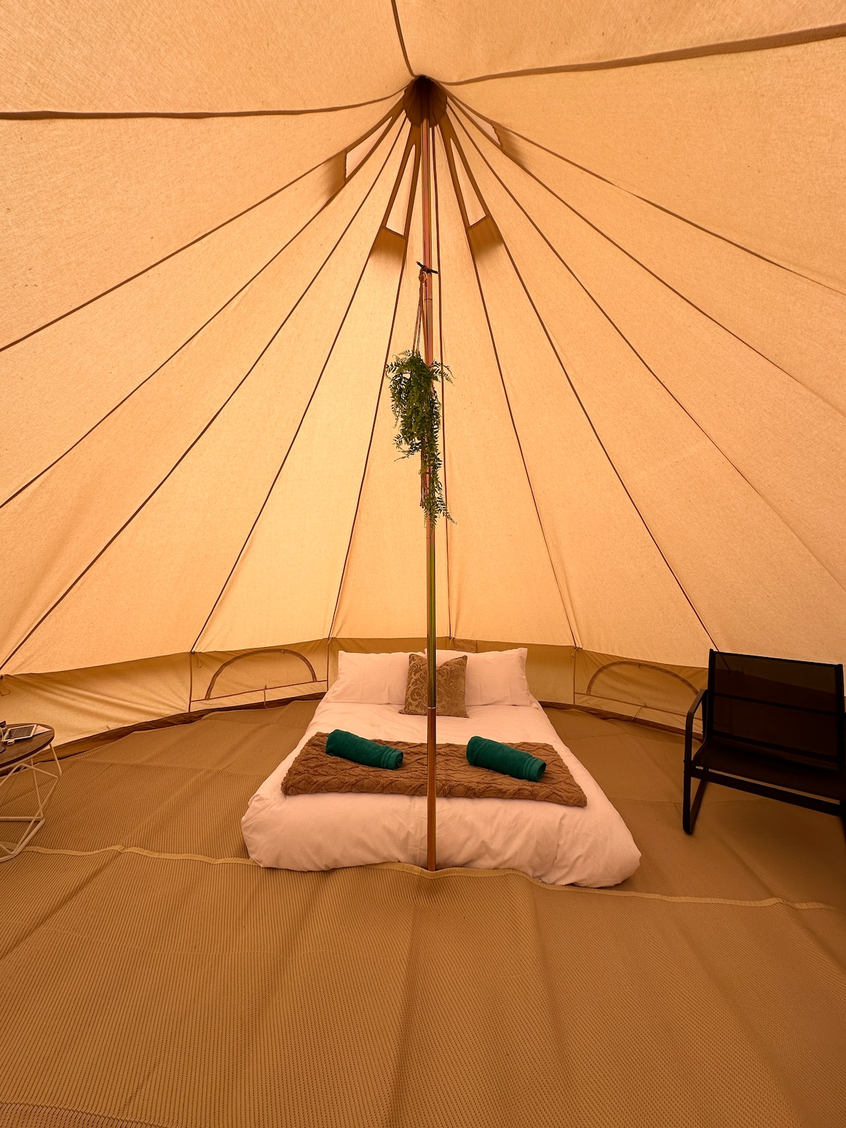 The Bell Tents We have 2 Large Bell Tents. They are about 10 metres away from each other. Our Bell Tents have beautiful wooden floors and are simply and attractively furnished with rugs, cushions, a small table, a wind-up torch and 2 lanterns, bunting and solar fairy lights. The Bell Tent are suitable for 2 people, and have a double futon with a brand new mattress. We only accept children age 12 and over and no dogs.