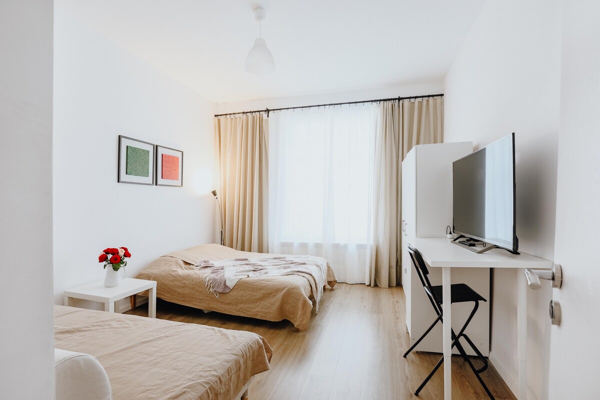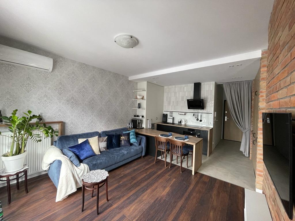 This modernly finished and furnished apartment is located in secured compound in the heart of the city of Lodz. Spacey living room with comfortable sofa, table and 4 chairs, TV cabinet and 55" TV with Play Station for with games as in the photo and with apps like Netflix, Apple Tv, Max, Prime is connected to fully equipped kitchen. Main bedroom queen size bed. Spare bedroom- double bed. One parking spot is dedicated for you, inside the secured area, next to the building.