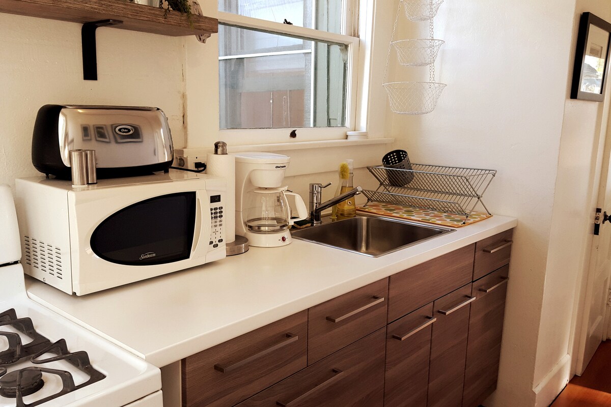 The one bedroom, one bath unit was recently remodeled (in 2017) and includes all new kitchen, bathroom, full size laundry and air conditioning. The large 400 square foot private deck has new outdoor furniture with views of Mission Bay and gorgeous sunsets year round. Enjoy a show on the 50" 4K LG smart TV in the living room which offers Netflix, Amazon Video, and major network TV stations. Cook a delicious meal in the kitchenette complete with a mini-fridge/freezer, microwave, electric stove top, coffeemaker, and more. If you plan to head to the beach, the storage ottoman is secretly a "beach box" containing a couple of folding chairs, beach toys, towels and a small cooler. The unit is stocked with coffee, shampoo, conditioner, laundry supplies, iron, and more. Filtered water is provided via a faucet on the kitchen sink. Easy check-in via a numeric keypad on the front door with the code provided prior to arrival. Plenty of street parking is available. We love meeting new people and live next door in the main house so we are available most anytime. We are both from San Diego and still love to explore the latest new spots so we are happy to give recommendations. Bay Park is a great central neighborhood originally built in the early 1940s. It was recently voted the most livable neighborhood in a recent San Diego poll. Check out the restaurants on Morena Boulevard, which are just a few minutes' walk away or explore all of the major attractions of San Diego easily. The house has easy access to I-5 and is only 10-15 mins from downtown, Sea World, the San Diego Zoo and the airport. The private guest house is located across from Mission Bay and within walking distance to bay, market, restaurants and coffee shops. Uber/Lyft is $8 to $14 to most of San Diego's main attractions. There is a bit of white noise from the highway down the hill near Mission Bay when out on the deck but nothing too bad, just worthy of mention. The unit has double paned vinyl windows so it's quiet indoors.