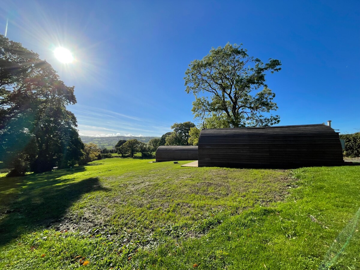 Wake up to panoramic views across the rolling Flintshire hills in this luxury, eco-friendly retreat - thoughtfully designed for romantic escapes and peaceful getaways. Sink into a king-size bed beneath a vaulted ceiling, with hotel-quality bedding, bespoke finishes and refined details throughout. On arrival, enjoy complimentary treats, fresh milk, and dog treats for our furry guests. Super easy access to Chester, Wrexham, Mold, Snowdonia and beyond.