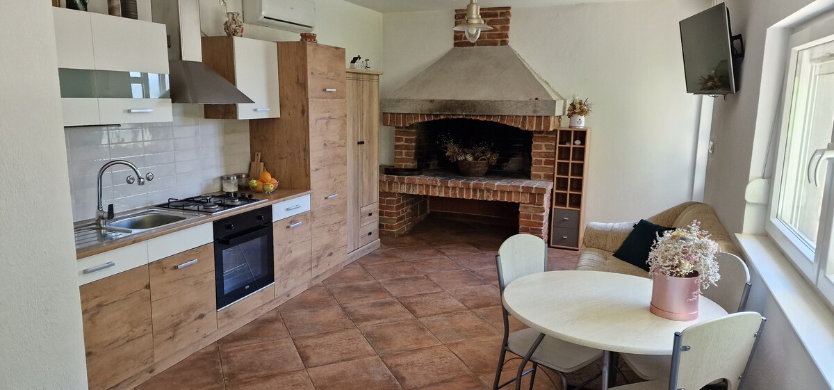 A cca 30m2 unique guest house/tavern next to our apartment villa. Detached from the villa itself, featuring an inside fireplace, A/C, kitchen, a sofa that folds out into a bed for 2 people (+ 1 extra bed if needed), a dining table and a small bathroom. There is also a table/chairs in front of the guest house as well, serving as a small terrace in the garden!