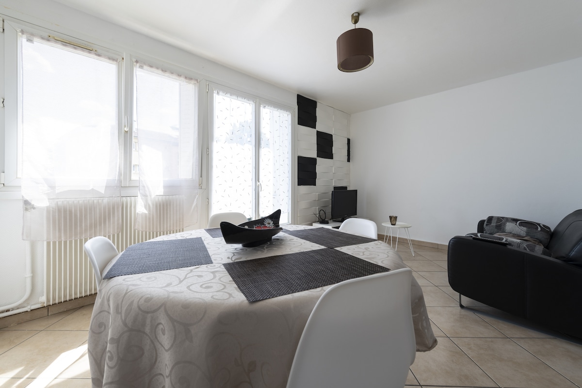 Bright apartment of 72 m2 fully equipped in the city center ideally located close to all shops on foot. 2 adults. Free private secure parking nearby (underground or on the surface, monitored 24/7). 1 Bedroom (20 m2) with a new 180 x 200 King size bed, 2 TVs. Large living/dining room with large screen TV. Large shower (120 x 90). Quick access and departure.