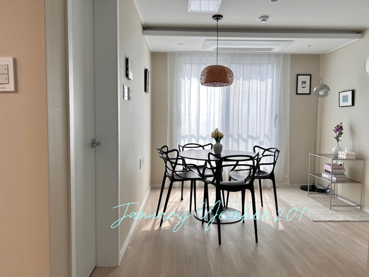 Located between an old apartment and a building in the city center This is a space that I designed and fixed myself, and my taste is permeated. As it is a more meaningful and comfortable place for me than anywhere else, I hope you will have precious memories here. --- Accommodation It is located 5 minutes from Western Dome, Lake Park, and Madu Station. Mart and convenience facilities are close by, and public transportation is convenient. --- Guest spaces/facilities You can conveniently enjoy movies and dramas by connecting the 65-inch 4K QLED TV with Netflix, Disney, and YouTube. (26py) Bedroom 1-1 king bed, bedroom 2-2 single beds. The 3-meter-long kitchen is convenient for cooking and is great for families to enjoy. It is equipped with a Bluetooth speaker and a styler. Hand drip coffee tools and coffee beans are available.