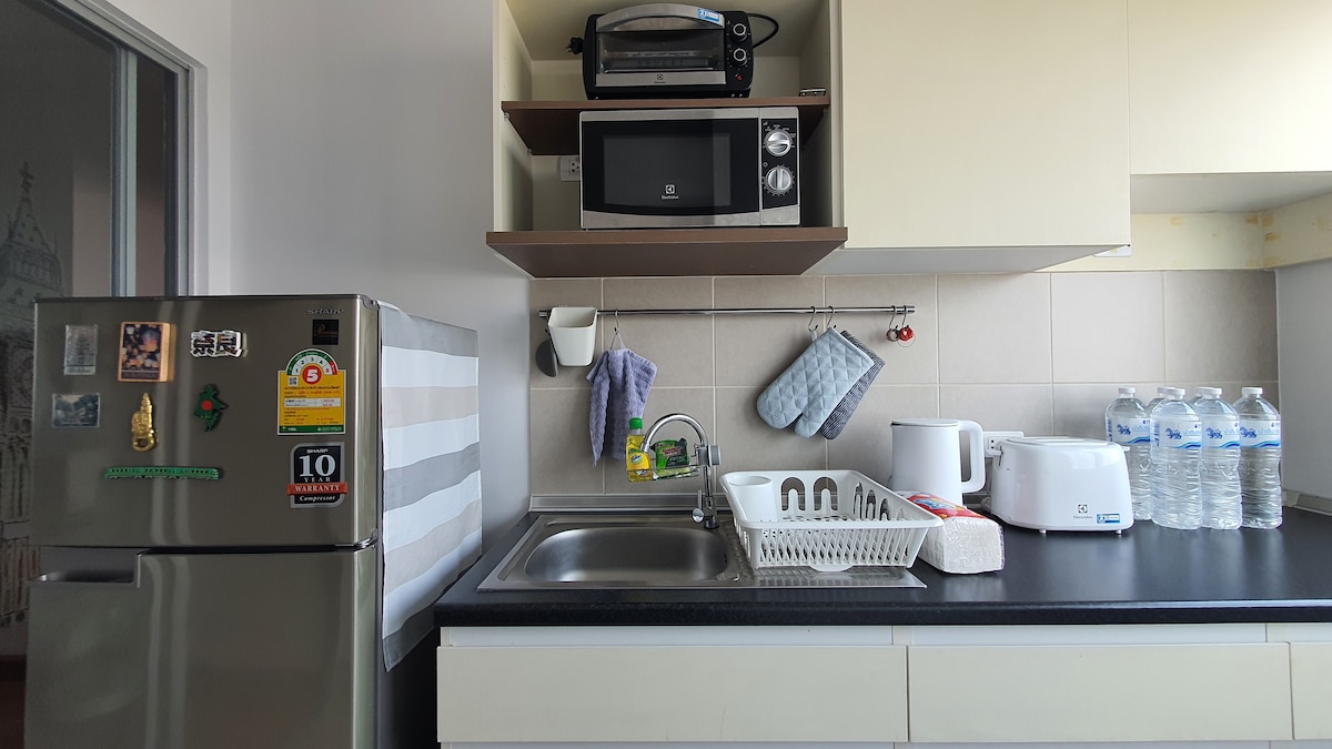 1 large room, living room and bedroom with living area, nice view, very good atmosphere, suitable for relaxing or convenient meeting with parking, 34 sqm wide room size. Fully equipped with refrigerator, water heater, hot water kettle, microwave, TV, living room, 2 air conditioners. You have swimming pool, close to 7-eleven, Don Mueang International Airport, so many shops! as medical clinic, Mali Market for some REAL thai shopping experience, Impact Arena for big events & trades shows, good coffee shop; Bon A Blissx, Central Mall, and koh kret island for pottery class! Free wifi