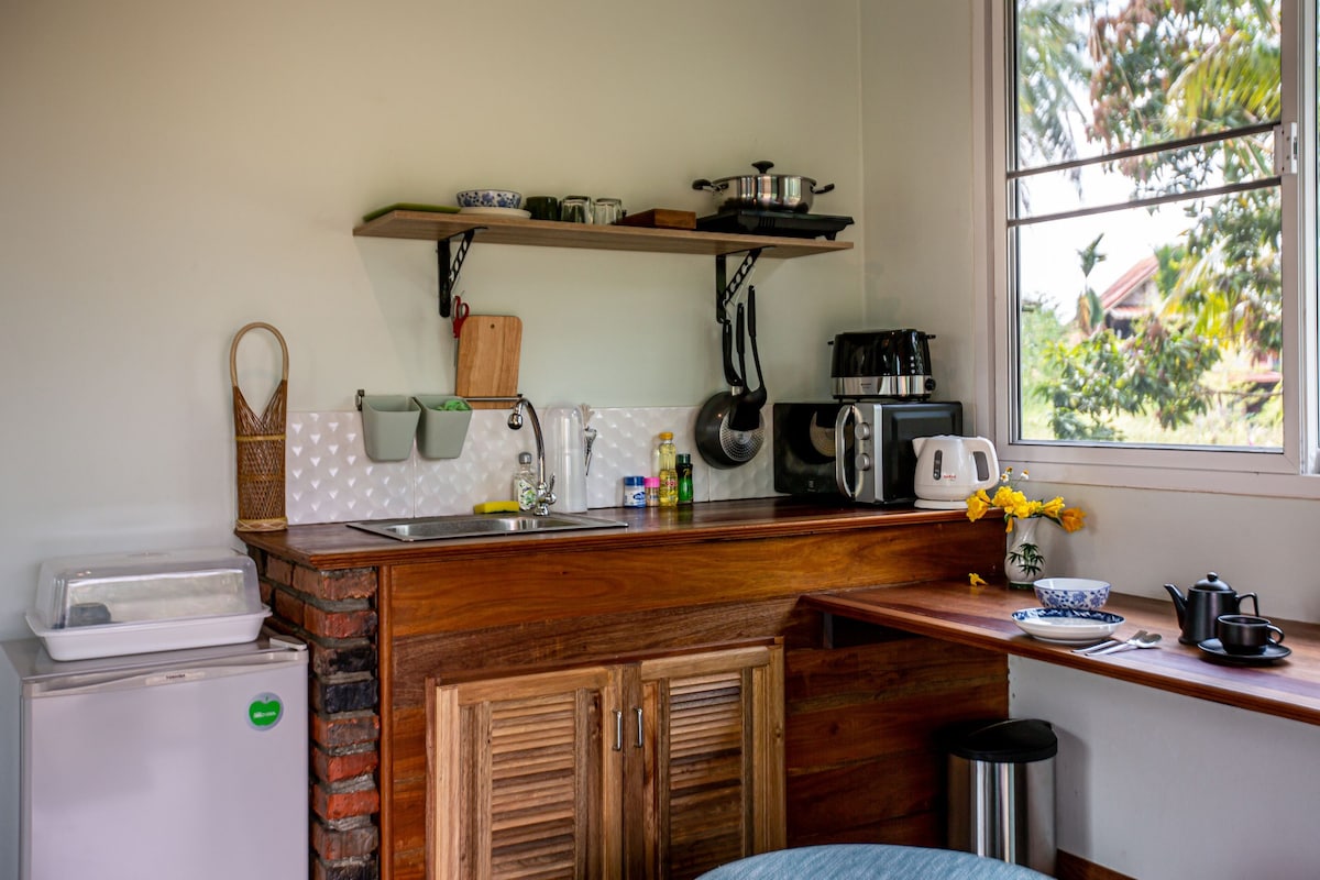 We are offering a modern studio house with big windows sitting on top of a hill amidst a scenic landscape with a natural pool, palm trees and lots of fruits and greenery. The place is the perfect destination for those who are looking for a place to escape modern life with all the convenience of AC and Wifi - while still being a short drive from Krabi City center and the beaches of Ao Nang.