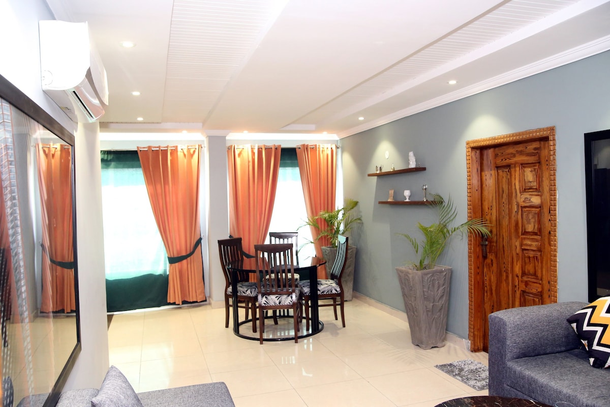 Spacious 2BR w/ AC and attached bath, 1 large living room, equipped kitchen, cozy lounge & dining, private balcony. Located in a secure residential area w/ 24hr armed guards in the lane. Near food street, 5-min to Haidary Mall, 20-min to Saddar/Tariq Rd, 15-min to Agha Khan Hospital. Close to mosque & all amenities. AC charges extra). hi-speed WiFi, generator backup, no water shortage.