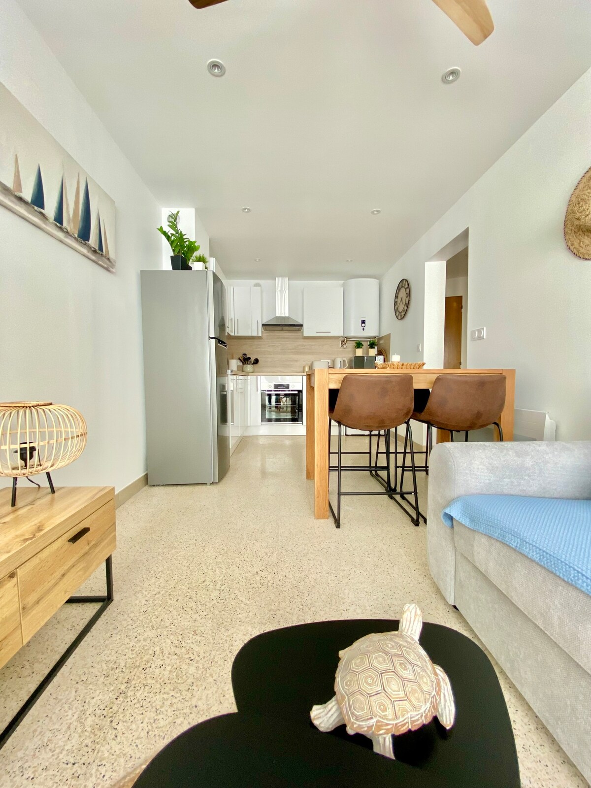 Kick back and relax in this calm, stylish space. 30 m² studio for rent located on the third and top floor with elevator, ideally for a couple and a child, with 6 m² terrace, fully renovated, fully equipped, air conditioned, sea view, with private parking in a quiet residence and close to all shops. Direct beach access and pedestrian area along the seafront to the city center. Private beach and restaurant nearby.