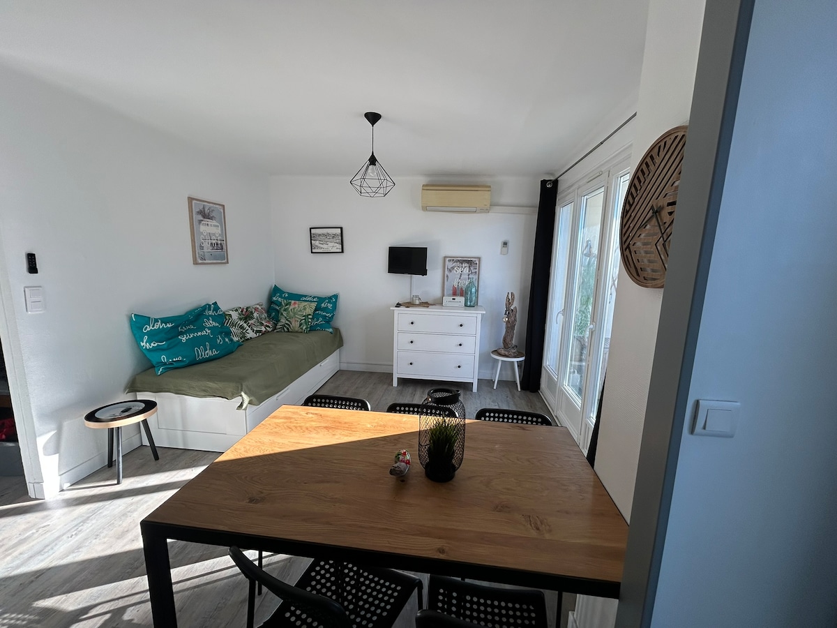 Rare on Airbnb! Nice little two-room apartment "feet in the sand", 180-degree uninterrupted view of the "Grande Bleue", 100% direct access to the beach in 15 seconds and zero cars! Ideally located on the ground floor with a private terrace of more than 25 m2: teak living room, plants, electric awning for your reading/apéritifs while lounging facing the sea at 180°! Private numbered and secure parking. Apartment with a small closed bedroom. It is sunny, modern, well-equipped and renovated.