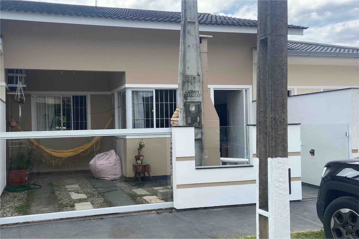 The residence is a family space, a typical beach house with 100mts², large and cozy spaces on a quiet street, just 200mts from the sea and 3min from BR 101. The house is complete, private location, enclosed yard, holds up to four vehicles, bedrooms with queen beds, air conditioning and two bathrooms. The neighborhood is located between the sea and Serra do Tabuleiro, a strategic region to travel to the Center of Palhoça, Floripa or the southern beaches, also with trails and waterfalls nearby in minutes.