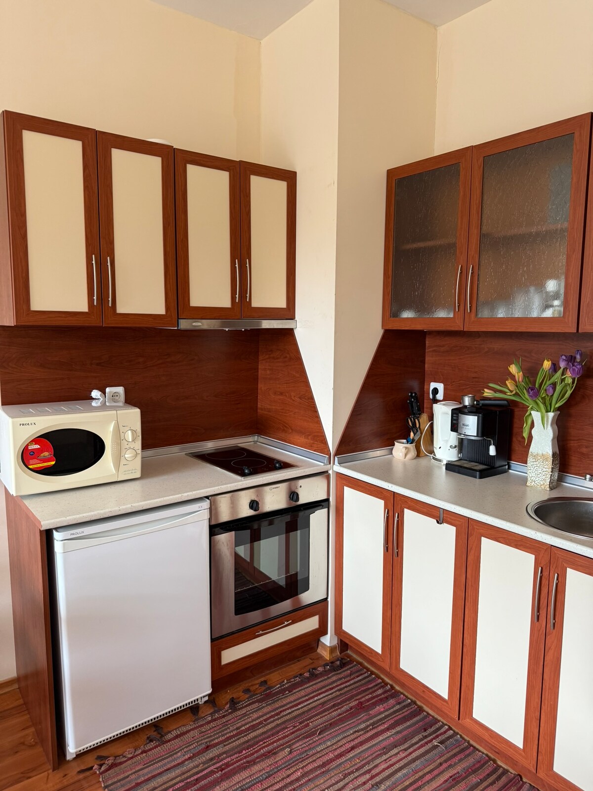 Spacious apartment with one bedroom and living room with kitchenette. Suitable for families or companies. It has a large bathroom with a shower and a separate toilet. Equipped with a washing machine, stove, microwave and fridge. The heating is with convector radiators in each room and fireplace. There's a gym next door. In the common areas of the hotel there is a billiard and games. 4-5 minutes walk from the Studenets ski slope, Pamporovo. There is no guaranteed parking space, but there are usually places; paid parking nearby.