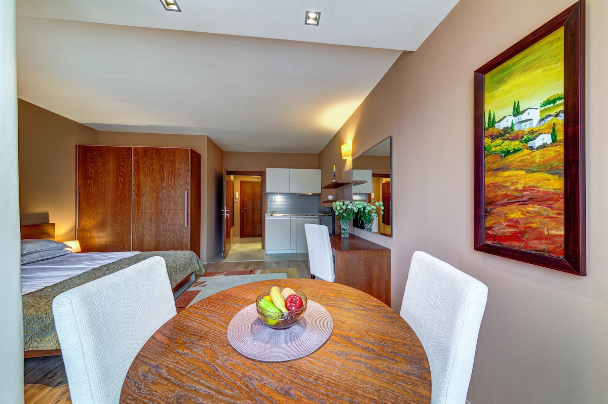 Saint Trifon Apartments have an excellent location at the beginning of Pamporovo. Located in a four-etheic building with an asaner and garage. They stand out in style, sophisticated surroundings, offer excellent opportunities for recreation, sports, hiking. The apartments offer a modern and functional design with a magnificent panoramic view. The location is perfect for year-round adventures in the mountains. Located near several restaurants. At 200 m. there is a Tourist Center,Ski center and a lift to Studenets