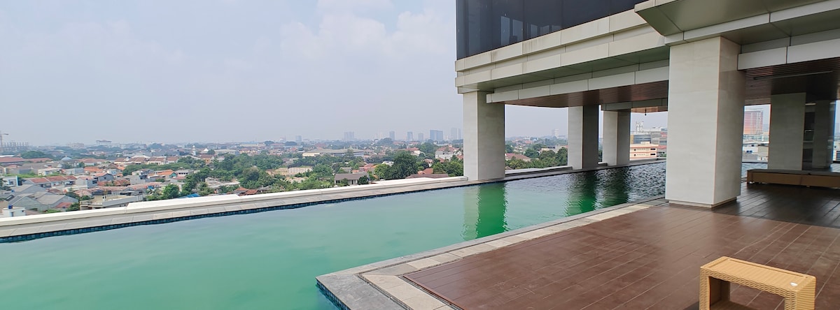 Kick back and relax in this calm, stylish space in South Jakarta, right next to 7 hectares ecopark. Industrial design, luxurious studio full-furnished apartment : fully equipped kitchen (stove, refrigerator, Nespresso machine, all cooking and dining equipment), 43-inch android tv, sofa, queen bed, bathroom with hot shower. Building facilities include swimming pool, jacuzzi, gym, and parking space. At 22nd floor, you have a splendid view of Jakarta city.