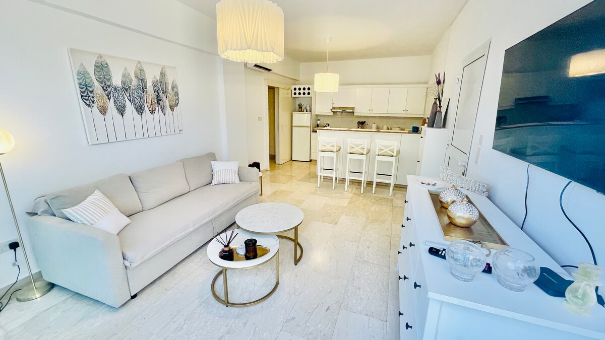The 2 bedroom apartment was renovated in February 2022. It has all the latest amenities, it's cosy, big, comfortable and has beautiful style. The kitchen has everything you need like hobs, mini oven, cookery essentials. It's very close to many hotels in Kato Paphos and to many archeological museums. Private parking is just outside of entrance door. Huge supermarket is opposite from the apartment. 3 minutes walking to the sea and 8 minutes walk to the old harbor and old castle.