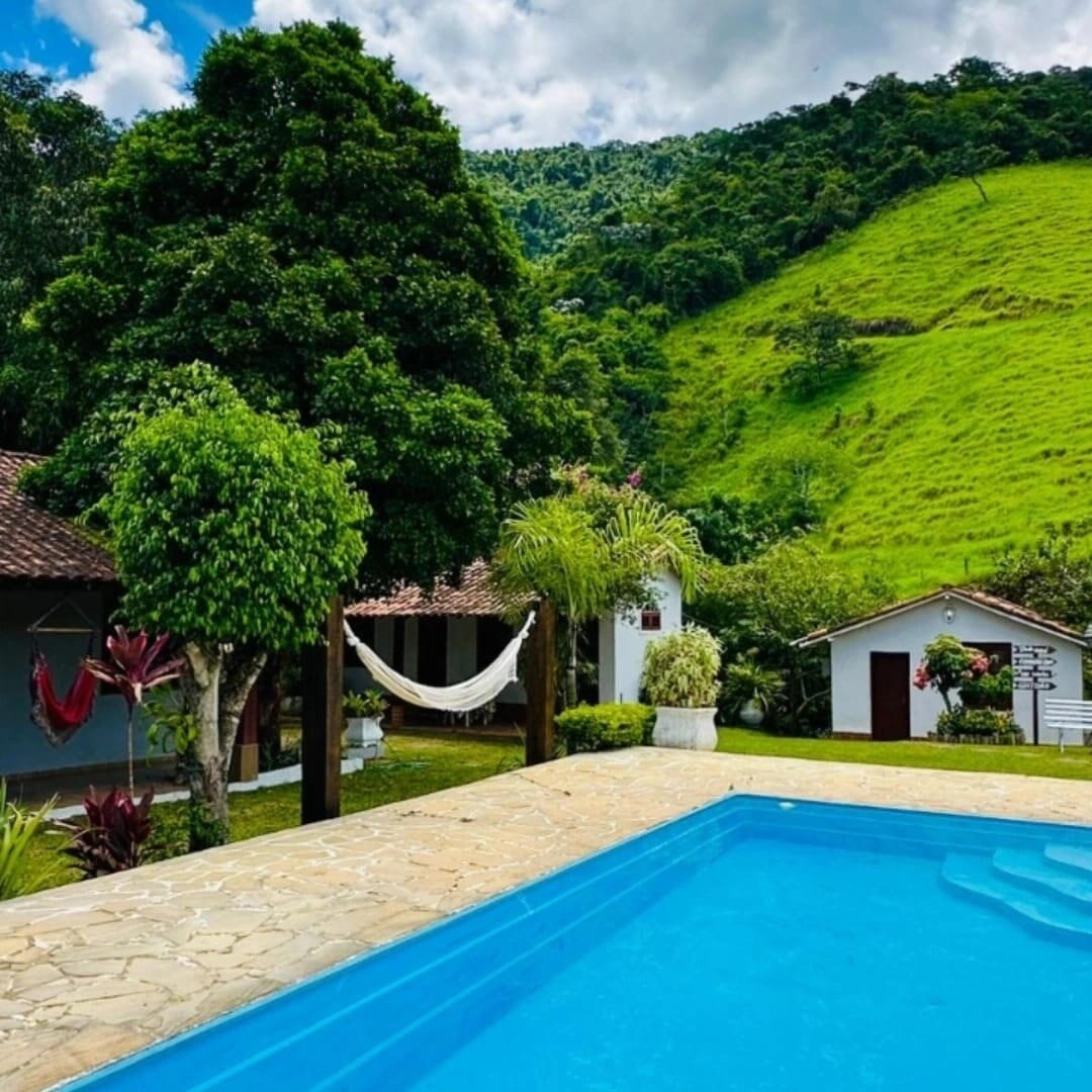 ✨ House overlooking the mountains, family atmosphere and mountain climate. The ranch has a swimming pool, barbecue area and animals such as horses, chickens, cats and dogs, in addition to birdsong. 🌿 A 5-minute walk away there are trails, a lake, a court and a soccer field. 📍 Location: Engenheiro Paulo de Frontin, 30 min from Miguel Pereira. 💫