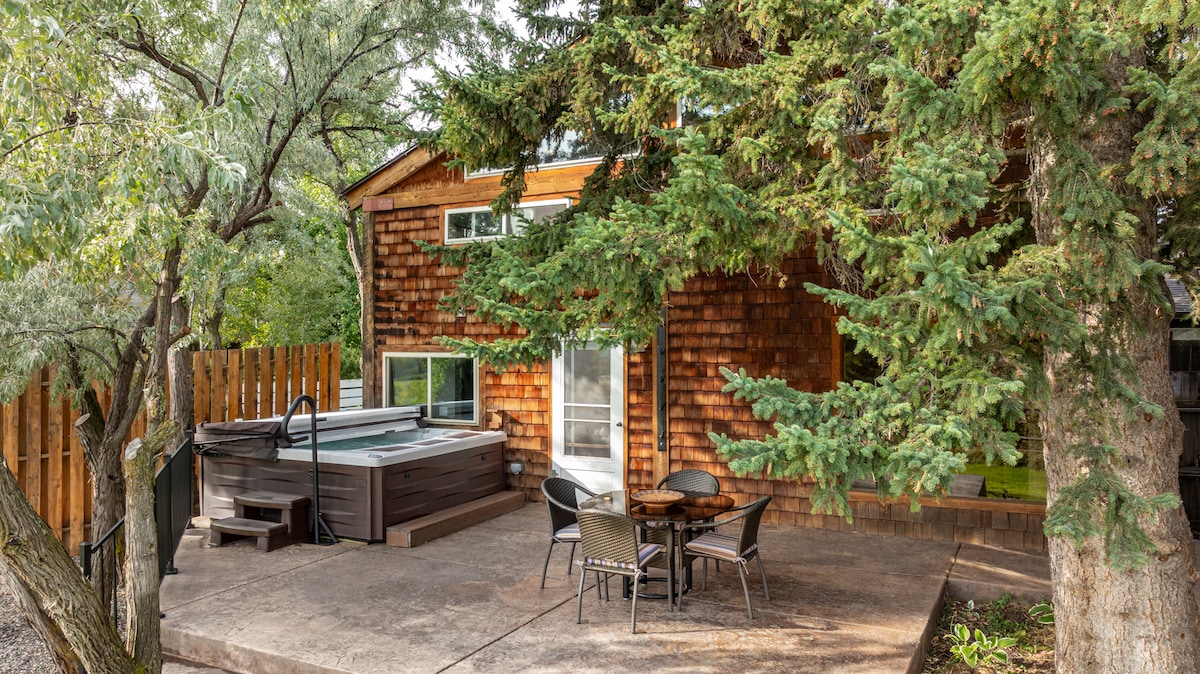 Retreat to the fire pit of your luxurious healing farm cabin with your very own giant round hobbit window and gaze at the twinkling night sky, unparalleled majestic views or play with the goats. Only 6 min from town, come rest, play and heal in your private cabin that sleeps 4 with all the comforts from a clawfoot tub, high-speed wifi, limitless hot water, full kitchen with Italian farm sink, king sized bed and twin pull out couch, art from around the world and soak in an ozonated jacuzzi!