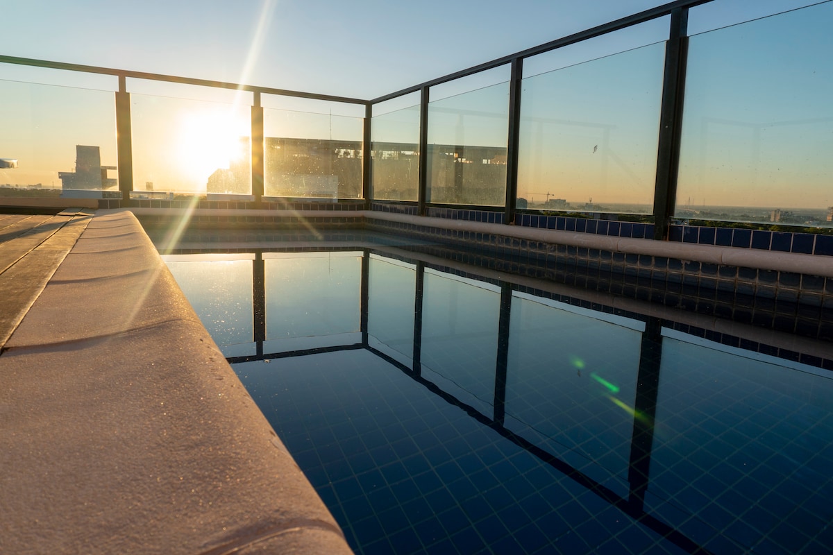 Brand new apartment in a luxury building. It has 40m² of its own, with Smart TV, WIFI, and in the building you have all the amenities: Swimming pool, air-conditioned Quincho with grill, children's playroom, equipped gym, etc. It is a 5-minute drive from the capital's most valued corporate center, and a 25-minute walk. It is also an 11-minute drive to Silvio Pettirossi Airport It has a double bed + a sofa bed. In total, up to 3 people can sleep.