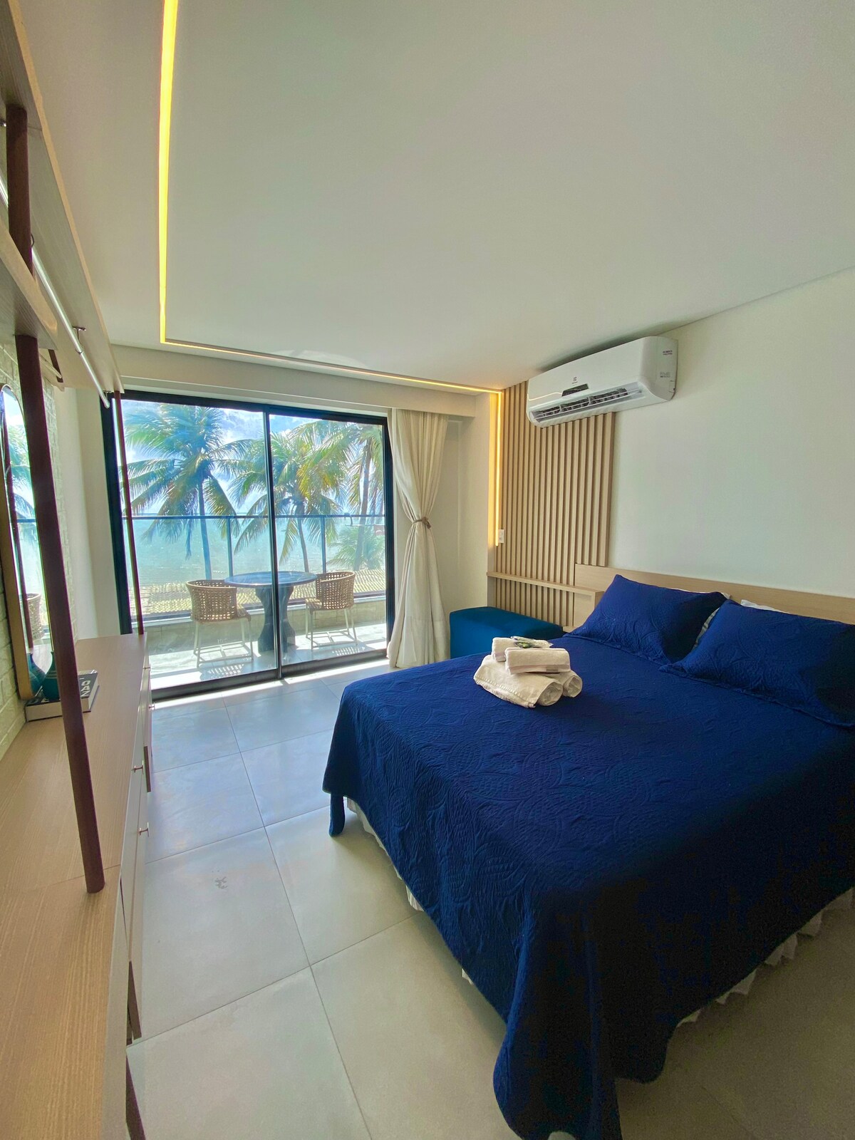 Mediterranean studio on the sand in João Pessoa. With white and blue decor and rustic details that bring the charm of Greece to the coast of Paraíba, this compact and cozy studio overlooking the sea is ideal for couples or solo travelers. A charming retreat, perfect for relaxing, without giving up comfort and a perfect location, close to great restaurants and tours. Complete and well equipped, it also has a leisure area with a swimming pool, gym, laundry and parking.