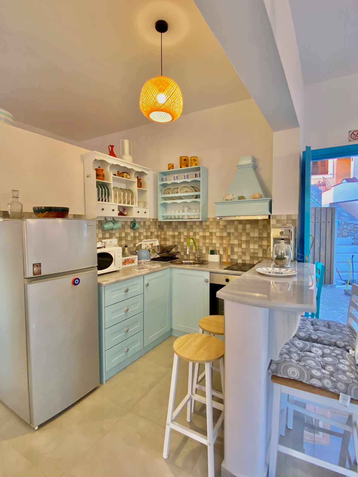 Place of wonderful aesthetic in Kantouni, fully furnished and equiped. Guests have access to the tree garden with fruit to collect. The can also enjoy relaxing moments at the beautiful yard of the house. The house is located very close to Kantouni beach (3 minutes on foot), popular bars, restaurants and a supermarket. An ideal place for those who are looking for quality vacation time.