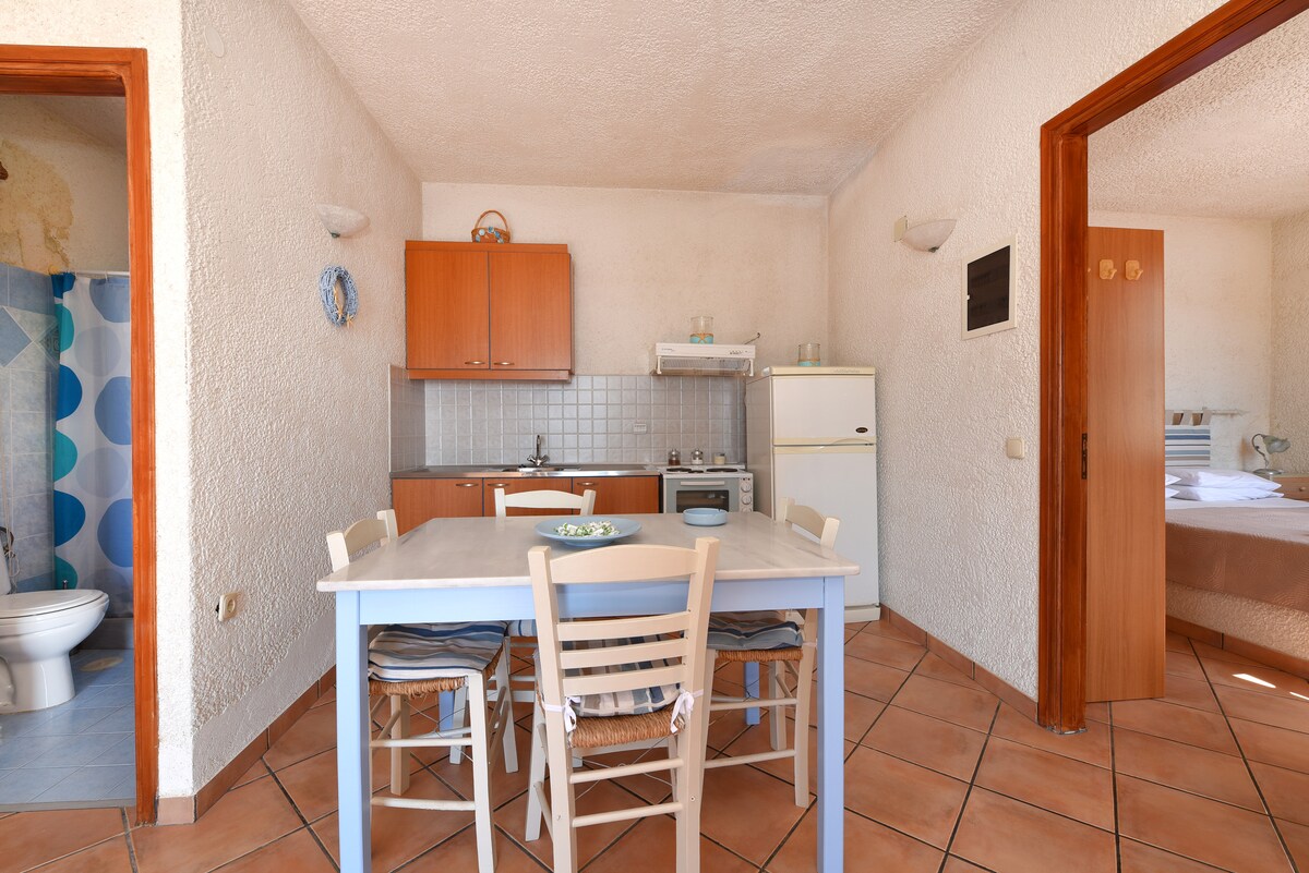 Fully equipped one-bedroom apartment with frontal sea view. One double bed in the bedroom, and 1 sofa bed in the living room, fully equipped kitchen (oven, fridge-freezer, dishwasher, 4-pits), bathroom with shower , washing machine, private terrace with chairs and table. Access to a shared patio with direct access to the sea (rocks) where the guests can take a morning swim. Frontal sea view from living and bedroom. A few steps from the center of Ermoupolis.