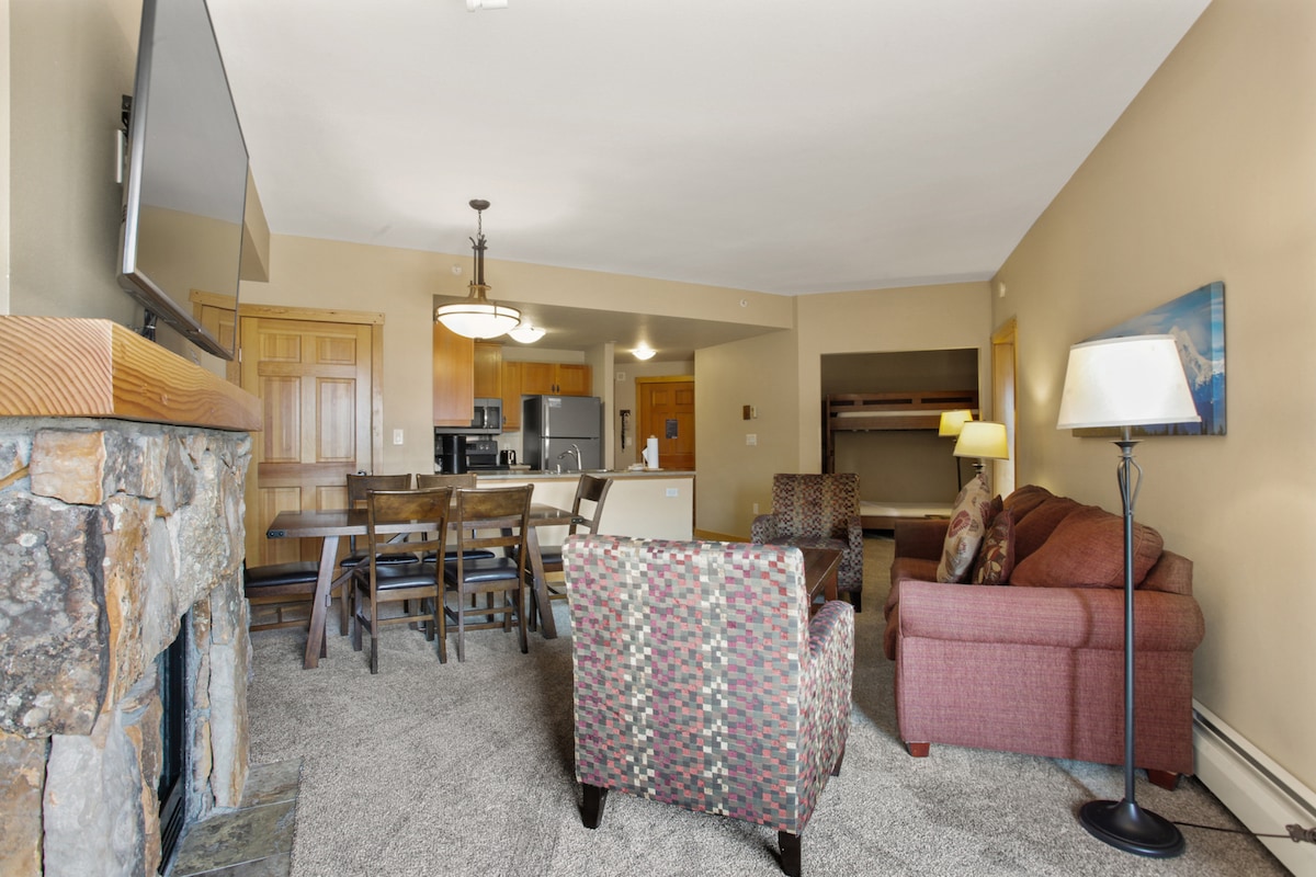 Warm up to suite luxury in this 1-bedroom mountain retreat that comfortably sleeps 4. Nothing warms up cool Rocky Mountain evenings like a serene moss rock fireplace right in your living room. Or, a private balcony to après-ski with a glass of wine or a Colorado brew. Cozy up on the sofa (opens to a comfy queen bed), watch movies on the 44" flatscreen HDTV with DVD player, and fit in some precious productivity with complimentary WiFi.