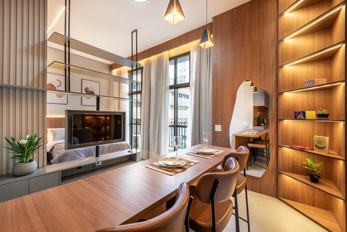 Relaxe neste espaço calmo e cheio de estilo. Studio de 20 m² aconchegante, iluminado por luz natural, versátil e localização privilegiada (4 minutos do metrô Brooklyn). - Smart TV; - Wi-fi; - Geladeira; - Microondas; - Adega climatizada; - Cafeteira Nespresso; - Ar-condicionado; - Cooktop 2 bocas (3 panelas; utensílios; talheres; copos e taças); - Filtro acoplado a torneira da cozinha; - Todas as torneiras tem água quente; - Sacada fechada pode ser aberta; - Maçaneta inteligente - Secador