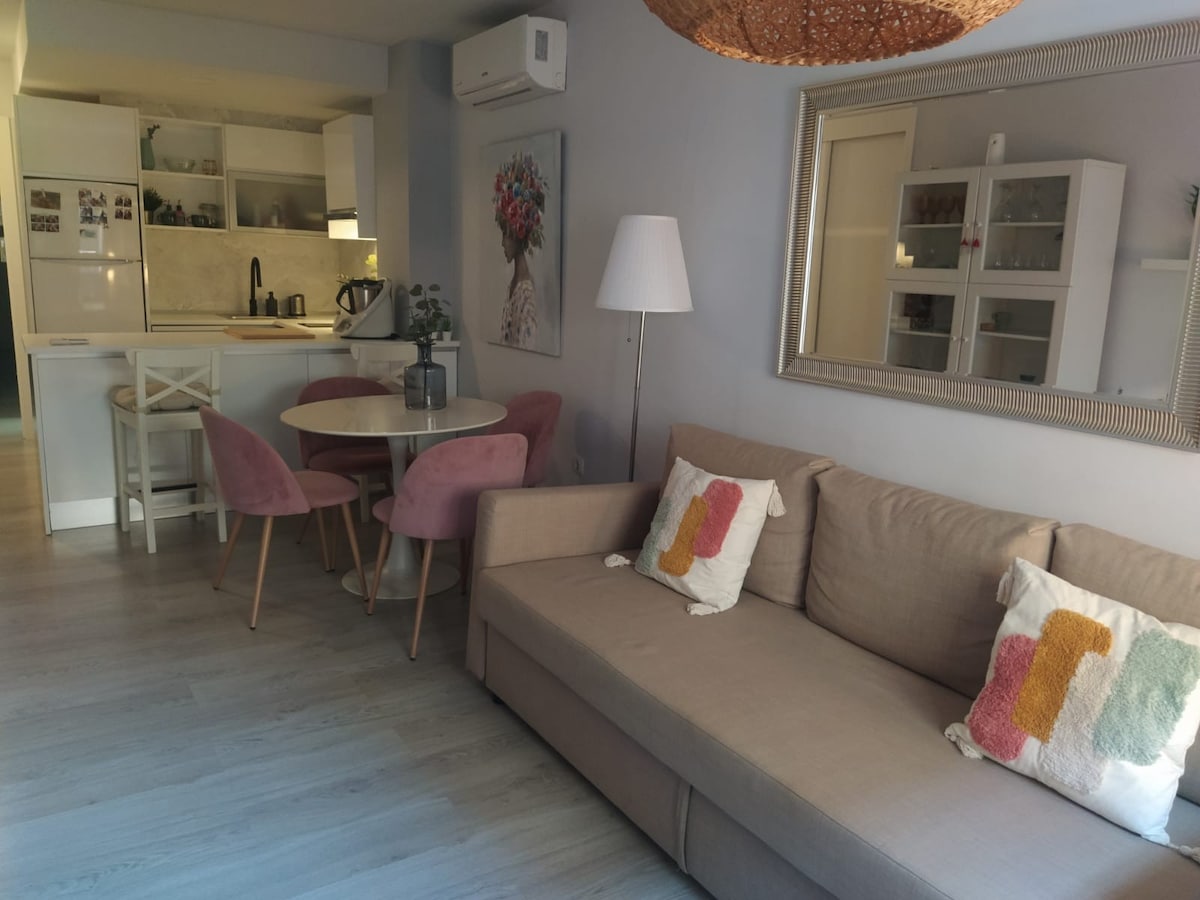 Beautiful apartment, fully equipped, decorated with a lot of personality. Excellent location, in a quiet neighborhood, with countless shops, close to the promenade, where you can find all kinds of restaurants and beach bars. Everything is close by, a 5-minute walk from the beach, a 7-minute walk from Parque del Oeste, 10 minutes from downtown by metro or bus, and 30 minutes from Marbella. It has 1 large bedroom, a sofa bed, equipped kitchen, air conditioning, crib, baby bath.