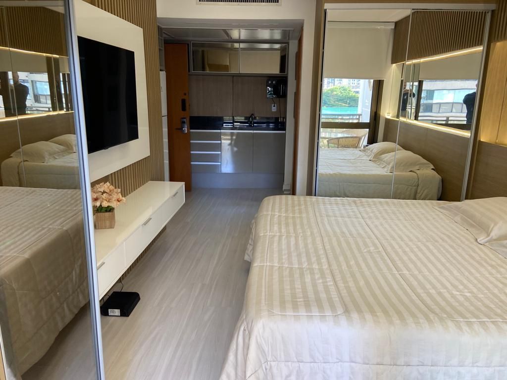 An excellent option for those seeking comfort and practicality for leisure or work. In front of Barra da Tijuca beach with a partial view of the sea, we have an infrastructure with swimming pools, fitness center, movie theater, beauty salon, free parking... Modern, the space offers a kitchen, air-conditioning, a double bed, and a balcony with an incredible view. Well located, in front of Barra beach at Posto 5, next to shops and restaurants and close to shopping malls, concert halls, tourist attractions...