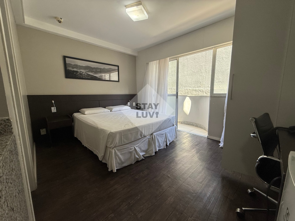Forget your worries in this spacious and serene space. Furnished Apartment Close to Pampulha Airport, Pampulha lagoon, Mineirão, Drogaria Araújo, BH and Verdemar supermarket, PRIMEFIT Gym, McDonald's, Beach Tennis, Lá Palma restaurant, Soul Jazz Burger. - 1 Covered parking space - 1 Bedroom with Air-conditioning (complete bedding) - 1 Bathroom (2 bath towels, 1 face towel) - American Kitchen (combined with the living room) For Guest Use - Community laundry