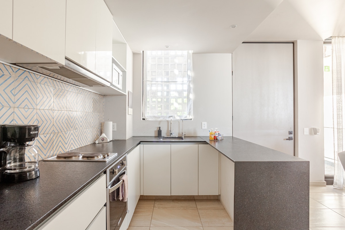 Modern and comfortable apartment 8 minutes from the beach, the ADO bus terminal and the ferry to Cozumel. Ideal for up to 4 people looking for vacations, weekends or long stays/home office (100MB internet inside the apartment). The building has 24-hour private security, a roof garden with a swimming pool, a gym, and a central garden that takes your breath away. Located in front of La Ceiba Park, 2 blocks from Super Chedraui, banks, pharmacies, and main roads.