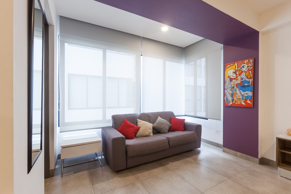 Comfortable apartment for 4 people. In a building specifically designed for tourism. Equipped gym, roof with pool, elevator, green areas, lobby and coworking area with high speed internet. Enjoy Playa del Carmen in one of the quietest areas of the city. In front of the "La Ceiba" cultural park and just 8 minutes from the beach. If what you are looking for is a quiet and well located place in Playa del Carmen, this is the option!