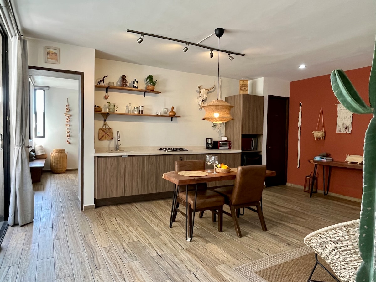 Give your walks and your days a spectacular starting point, where different styles come together to provide a unique experience. Rustic furniture, full of color, brings this modern apartment to life. Its balcony is a gem. The studio apartment is an open space where all the activities come together and you feel the spaciousness. You can always enjoy the connection with the terrace through a very large window that offers plenty of light to the interior space and a spectacular view of the city. It will become your home and our greatest wish is that you enjoy it to the fullest. We look forward to seeing you !! On the ground floor there is an Urban Garden where you can enjoy the multiple varieties of medicinal and edible plants and you can harvest some organic crops for your personal use and enrich your stay. We recommend that you enjoy it since it is a very beautiful space that was designed with great care, we would love for you to live it and enjoy it. We look forward to seeing you! Your stay and comfort is the most important thing to us and we will be available to quickly solve any need you may have. We are eagerly waiting for you to enjoy our apartment, which is undoubtedly your best option. The apartment is located in a quiet, cultural and gastronomic area, ideal for experiencing Guadalajara. It is three blocks from Mercado Juárez or Mercado México, and a 20-minute walk from the historic center. We recommend that you get around and get to know the city on foot, the apartment is perfectly located to live Guadalajara, very close to the historic center, Paseo Chapultepec, in a quiet, cultural and gastronomic area. You will be able to enjoy many of the attractions of our beautiful city without having to spend your money on any type of transportation. Living in the apartment is a very pleasant and welcoming feeling. When you open the windows and the space becomes one with the terrace, you will enjoy it very much. At night from the terrace you can see the planes take off in the distance and it is a show that you can enjoy. On Libertad street or in the Juárez market area (from the terrace and turning left you will see it 2 blocks away), you can enjoy delicious breakfasts in multiple cafes, the vast majority have terraces with trees and plants, you will experience quiet and enjoyable moments.