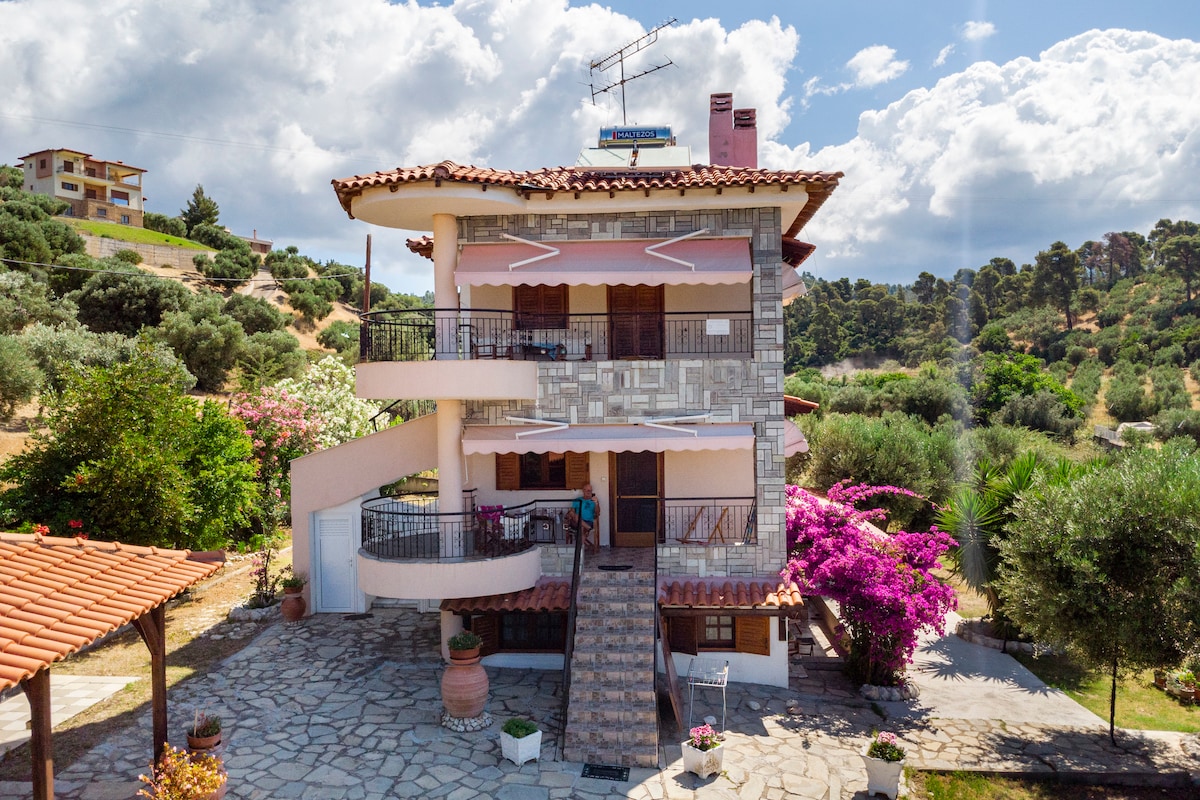 A unique experience in the heart of Sithonia, between the peaks of Olympus and Athos. On a 15-acre property with a 200-year-old family olive grove and exclusive access to a canyon of wild beauty, we built a unique residence in all of Greece entirely of river and sea stones, surrounded by the blue of the sea and the green of the forest. It is 5 minutes from the most famous beaches of Sithonia, Lagomandra, Elia, Spathies, Kalogria, Kovgiou.