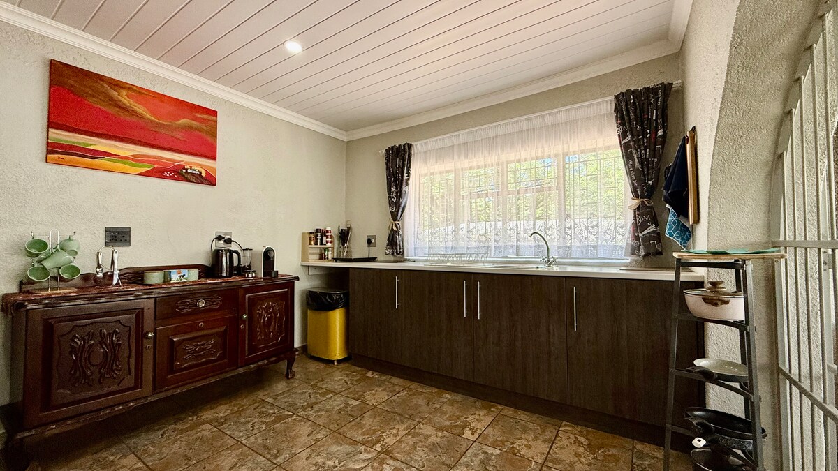 Enjoy plenty of room to relax in our large, bright apartment—ideal for business or leisure. The full kitchen makes cooking easy, and shaded parking keeps your car cool. An efficient air-conditioner ensures comfort, while a solar system and backup water supply provide dependable power and water during occasional outages in Potchefstroom. Located in a safe, quiet neighborhood, close to shops, restaurants and the NWU campus.
