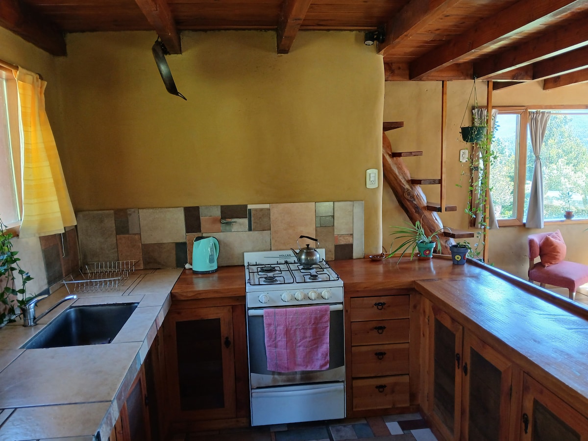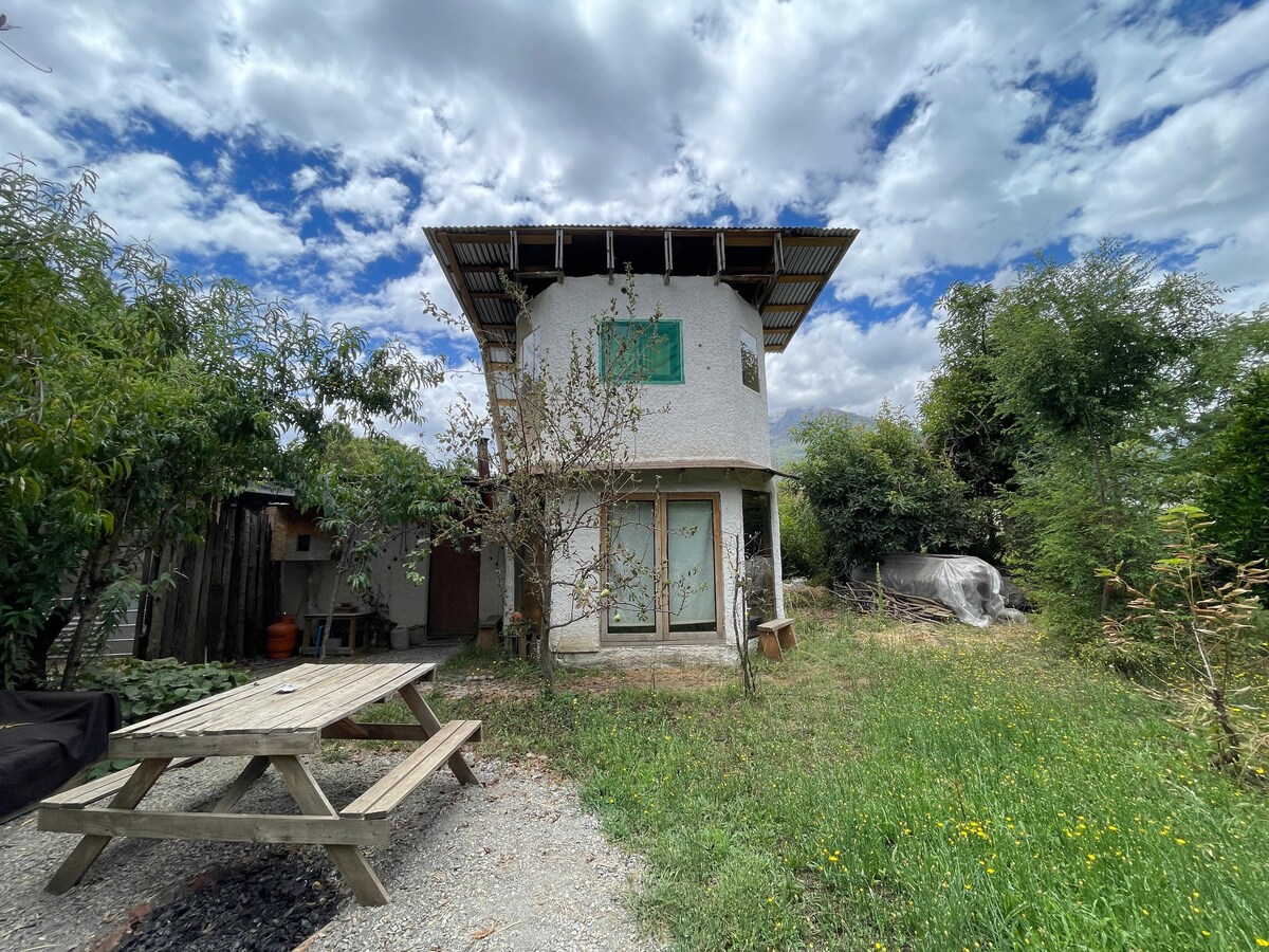 Cozy mud house in Cerro Amigo, a few meters from downtown and with the tranquility of the mountain, with a panoramic view of the valley and the mountain range. It is located on a property of more than one hectare shared with other cabins, in which each has ample space for privacy and rest.